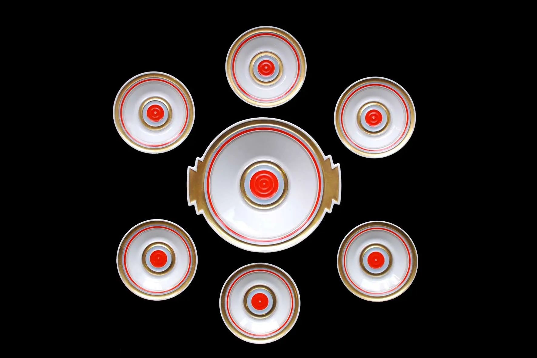 Porcelanowy zestaw do konfitur Sorau (Żary), śr. dużego talerza 21 cm, śr. małych talerzyków 11 cm. Początek XX wieku. Stan zachowania bardzo dobry.