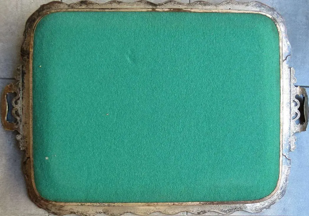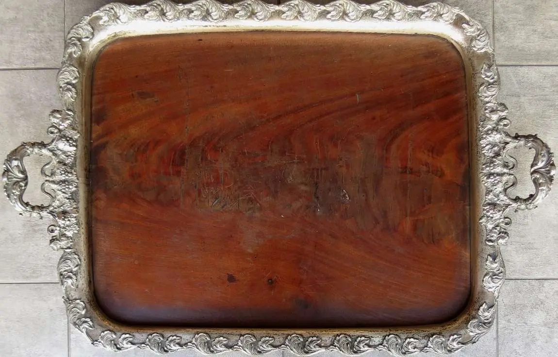 miedź srebrzona, drewno z okleiną mahoniową, zielone sukno, wym.: 9 x 78 x 51,5 cm; prostokątne mahoniowe lustro obwiedzione kołnierzem z reliefowym motywem liści akantu, dwa uchwyty z plastycznym motywem winorośli, na spodzie zielone sukno; sygn. (w owalu): Warszawa / Fraget / Plaque, wybity numer 3. Stan zachowania: dr. pęknięcia forniru. Warszawa, 1853-1860