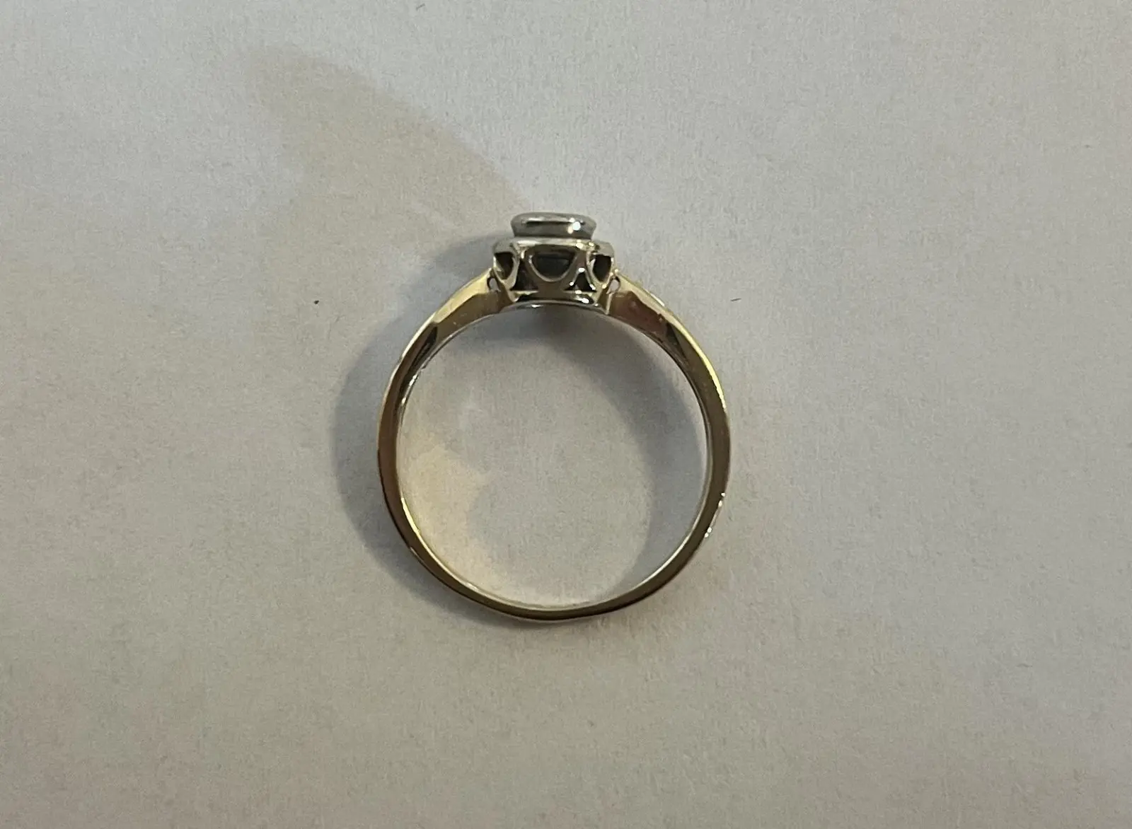 Pierścionek złoto pr. 585, z brylantem ok. 0,06 CT o czystości SI i barwie G. Waga 2,44 g. Rozmiar 13. Pierścionek zakupiony w salonie APART.