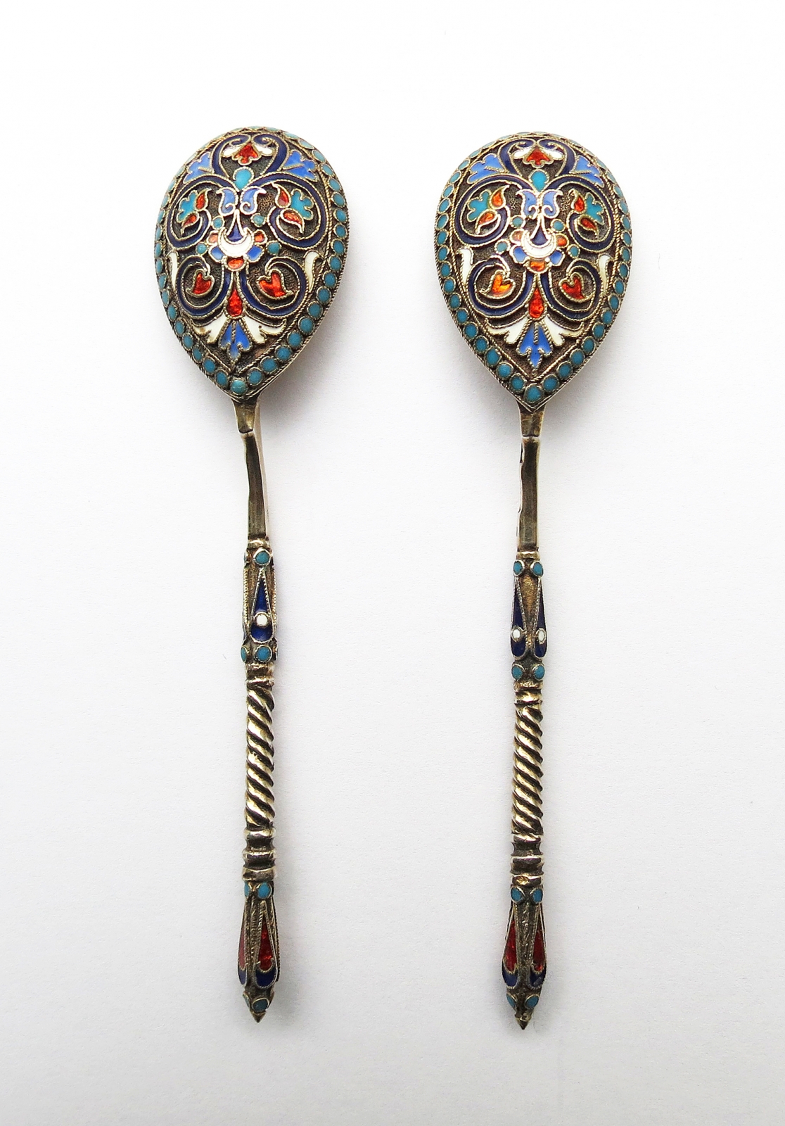 2 sztuki; nabierki na odwrocie oraz środkowe partie i zakończenia trzonków dekorowane emalią komórkową, trzonki częściowo kręcone; dł. 11 cm, waga jednej łyżeczki 15,8 g, srebro pr. 84, cechy probierni moskiewskiej  z lat 1880-1890, monogram złotnika (cyrylicą): S.K. (Siemien Kazakow), francuska cecha wwozowa z lat 1893-1990. Stan zachowania dobry.