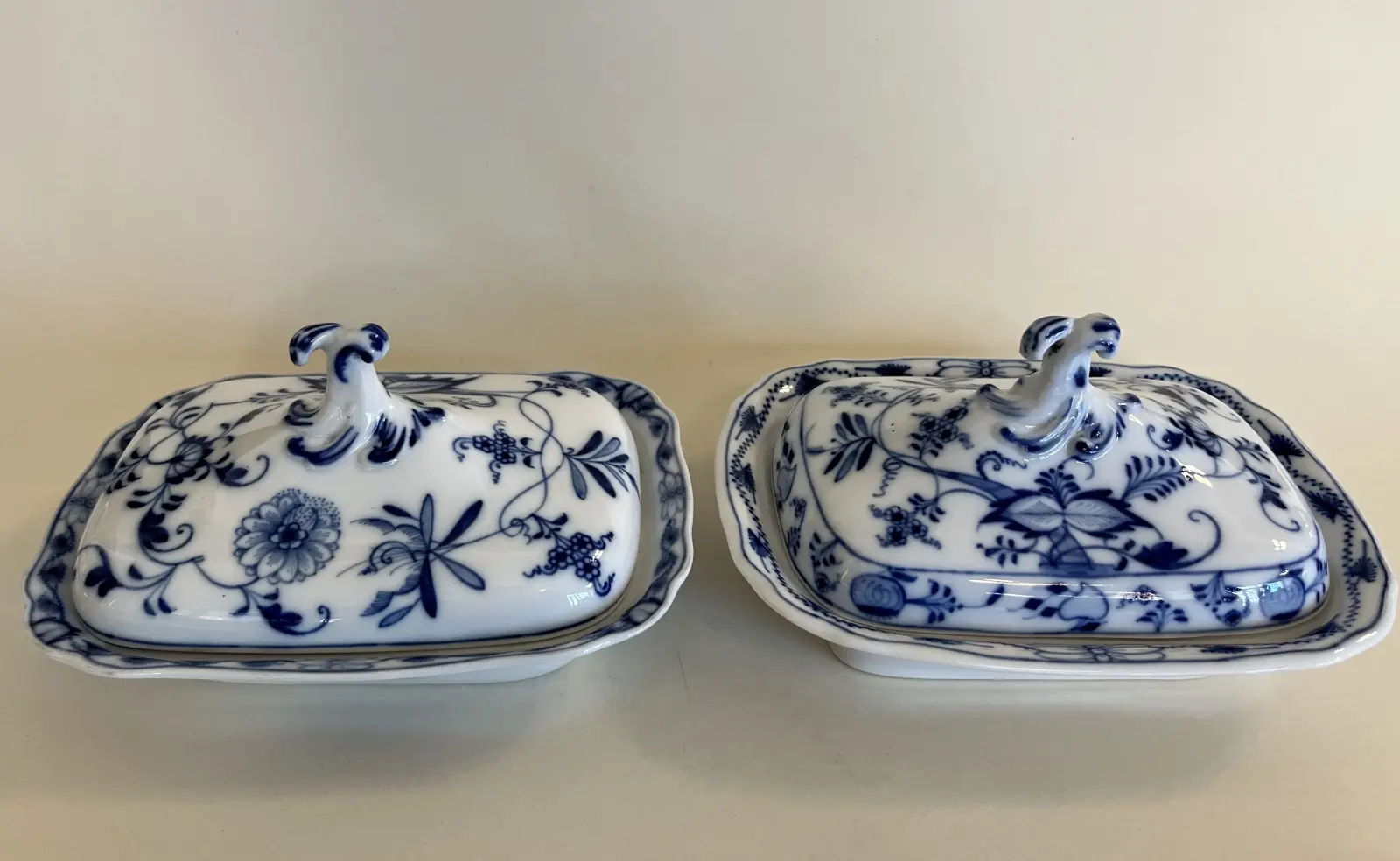 Porcelanowe teryny, malowane podszkliwnie, zdobione wzorem cebulowym.
