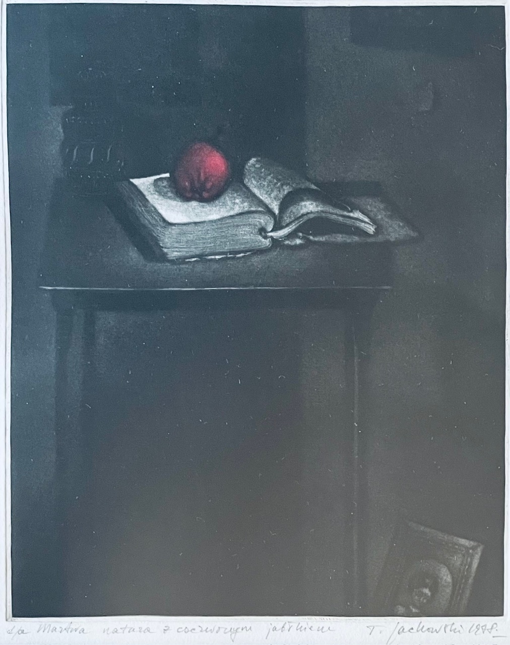 Grafika mezzotinta , odbitka autorska, sygnowana p.d. T.Jackowski 1978. format 24x20 cm, oprawa  45x39 cm.