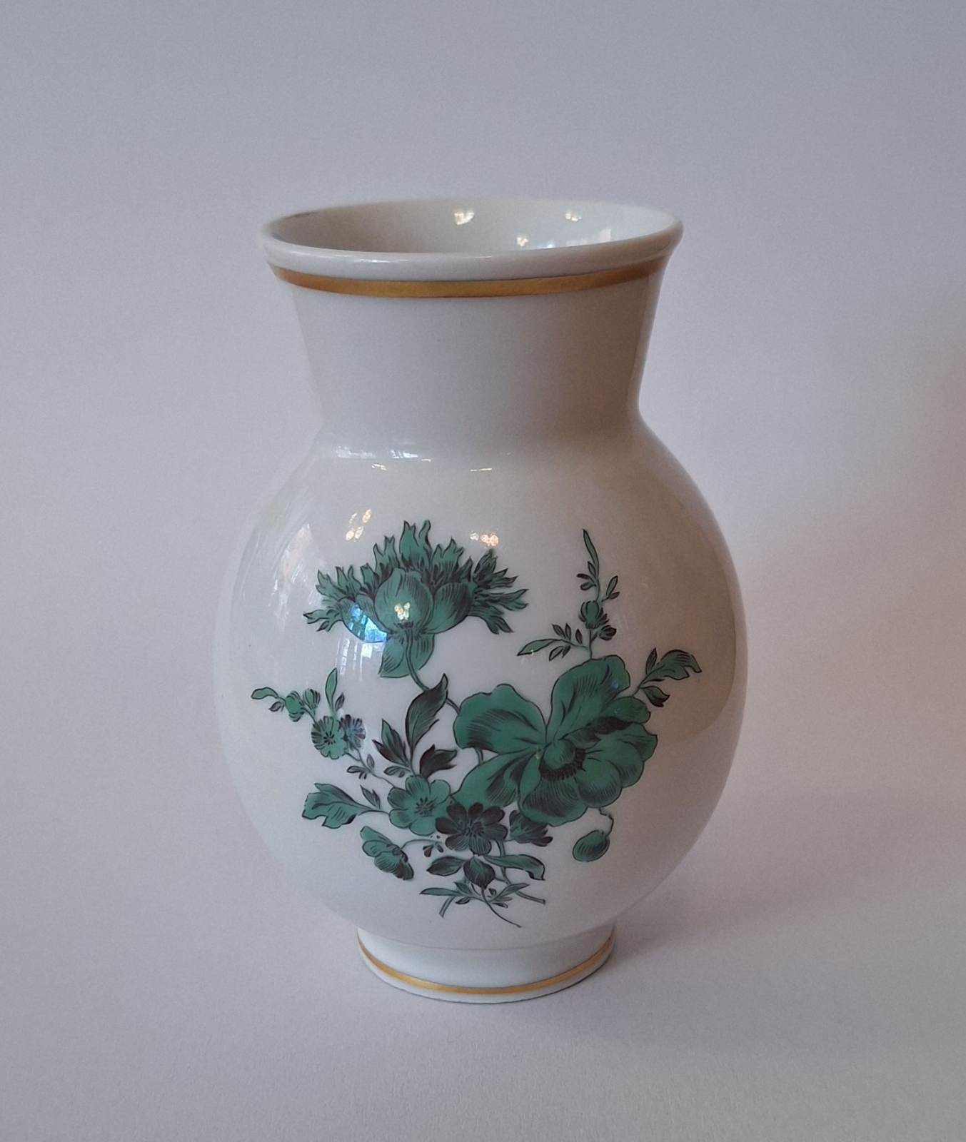 Porcelanowy wazonik produkcji Miśnieńskiej, wys. 9 cm, połowa XX wieku.