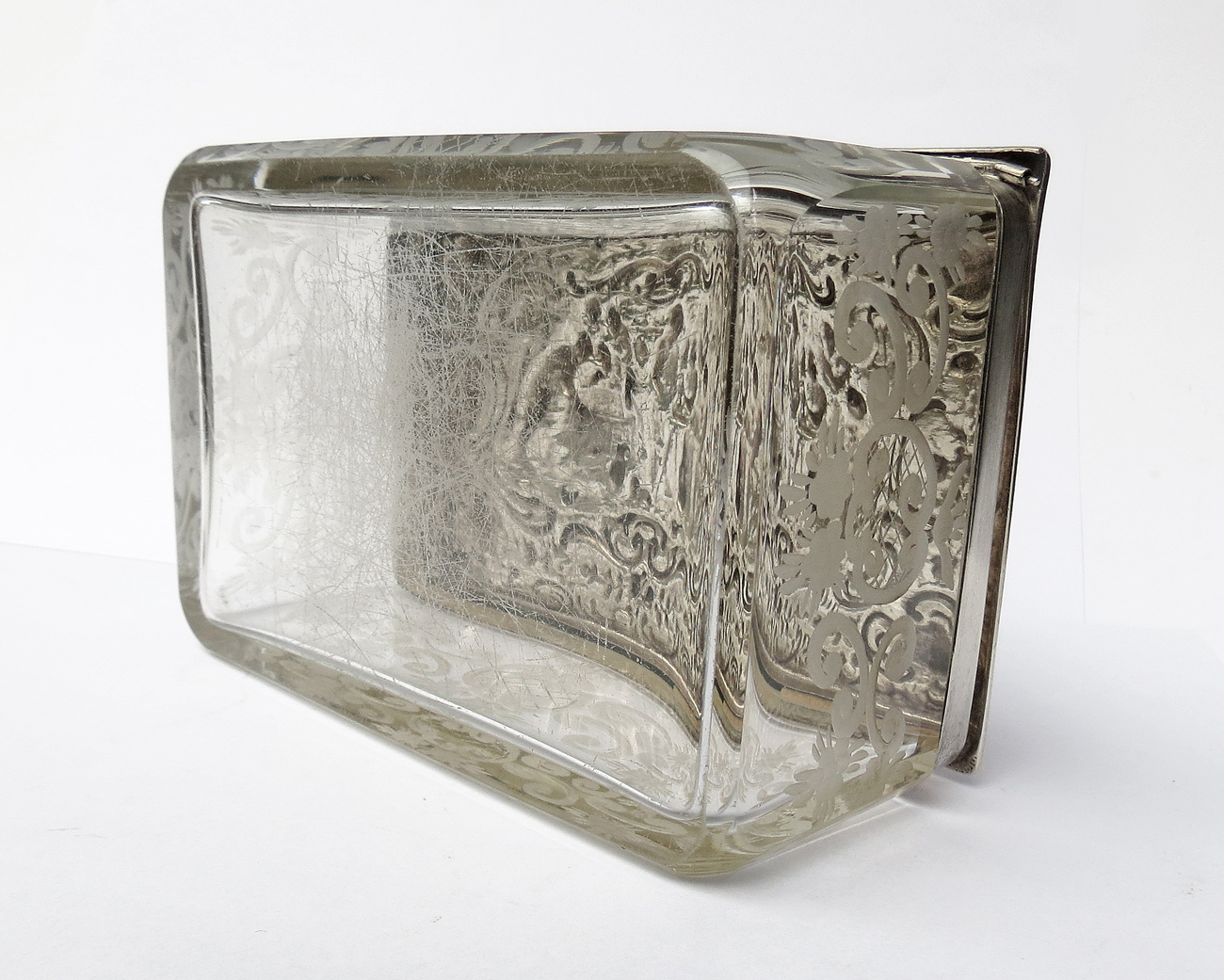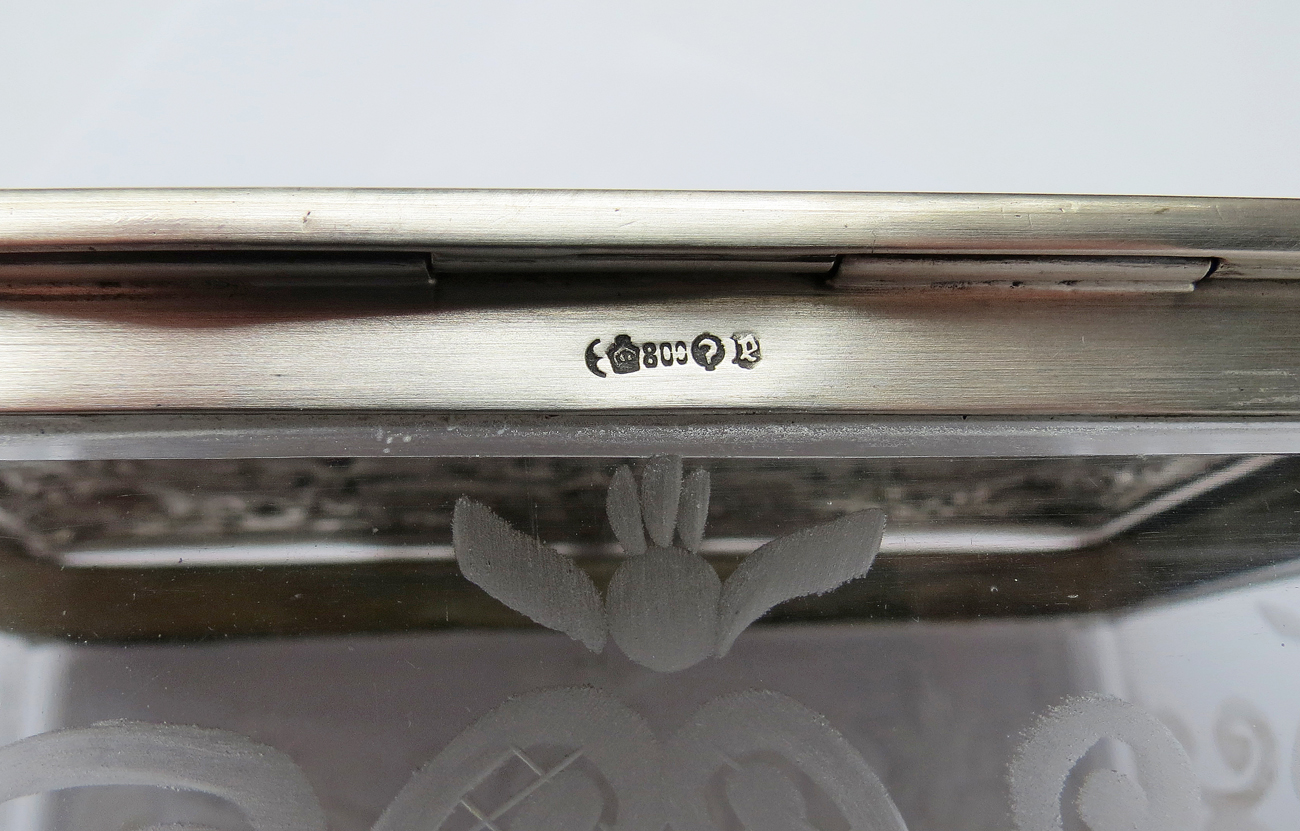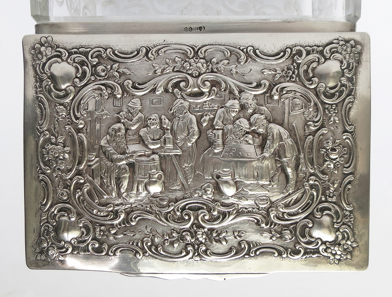 prostokątny korpus z bezbarwnego szkła, dekorowanego szlifowanymi motywami kwiatów i roccaile'ów,  srebrna lekko wysklepiona pokrywa z reliefową sceną w karczmie, obwiedziona motywami neorokokowymi; wym.: 7 x 14,5 x 10 cm, srebro pr. 0,800, niemieckie cechy po 1886, punca niemieckiej firmy złotniczej J.D. Schleissner & Söhne, Hanau ( jedna z wiodących firm zajmujących się w Hanau wytwarzaniem wyrobów srebrnych w stylach historycznych).