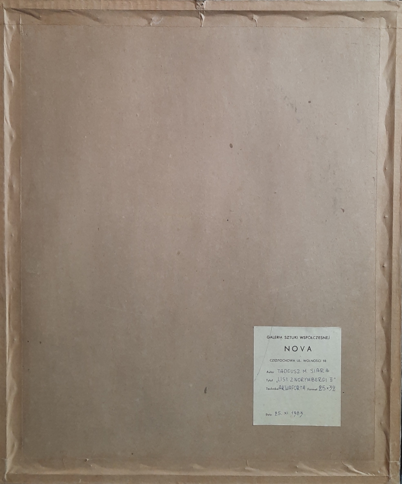 akwaforta / papier, edycja autorska; sygn. ołówkiem  p.d.: "Anielskie pozdrowienie" (List z Norymbergii II) / ś.d.: e.a. (akwaforta) / p.d.: Siara tm. 83; wym. 32 cm x 25 cm (odcisk płyty); oprawa listwowa, passe-partout, szklenie