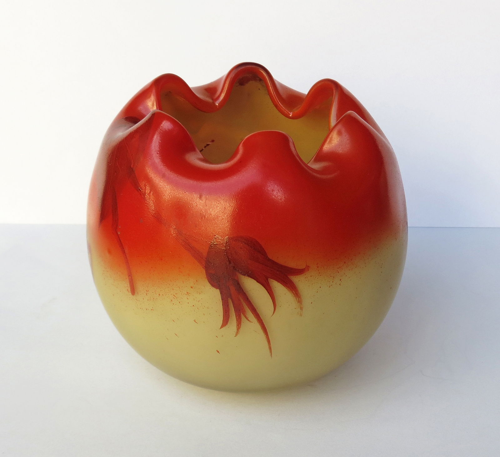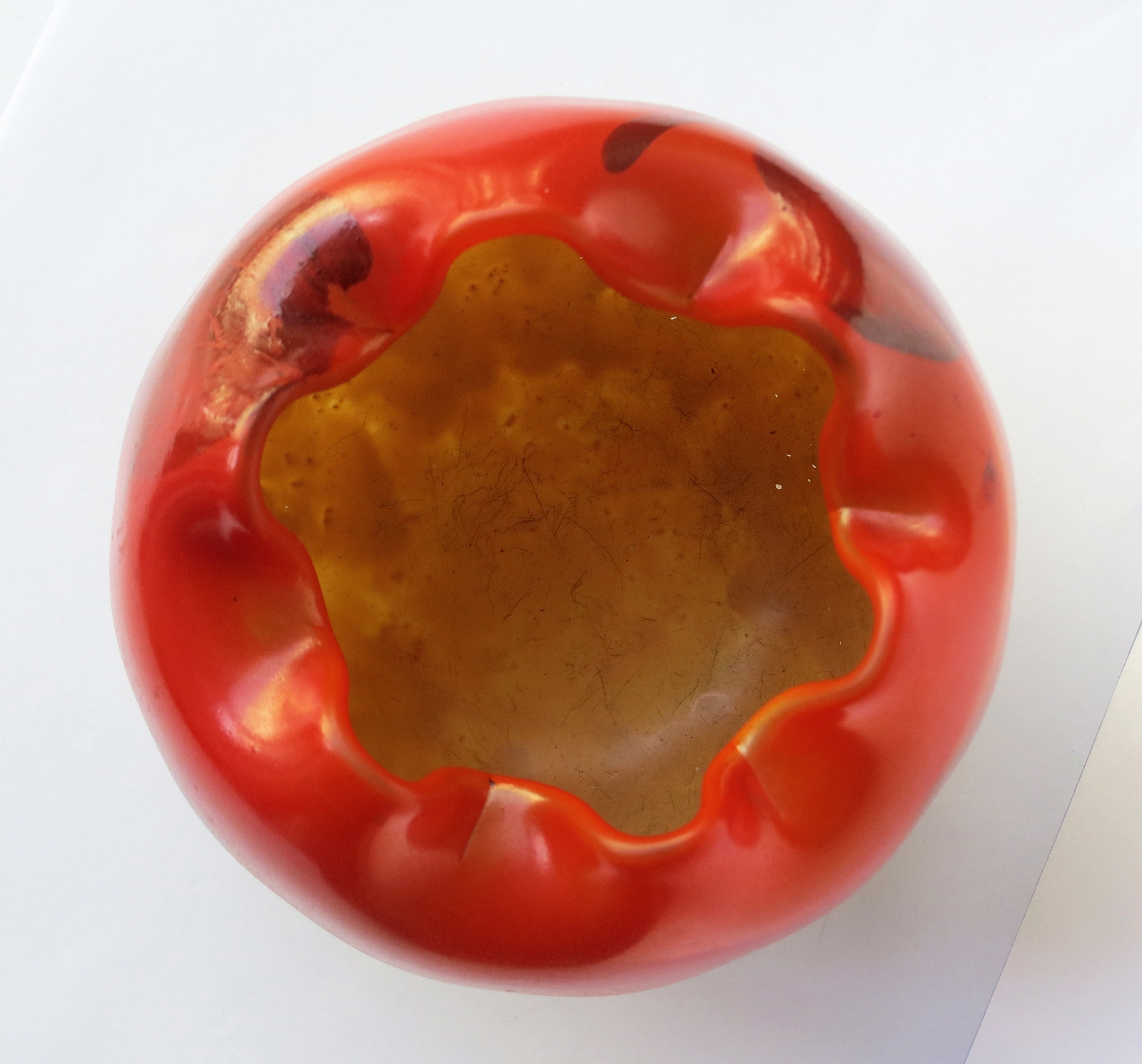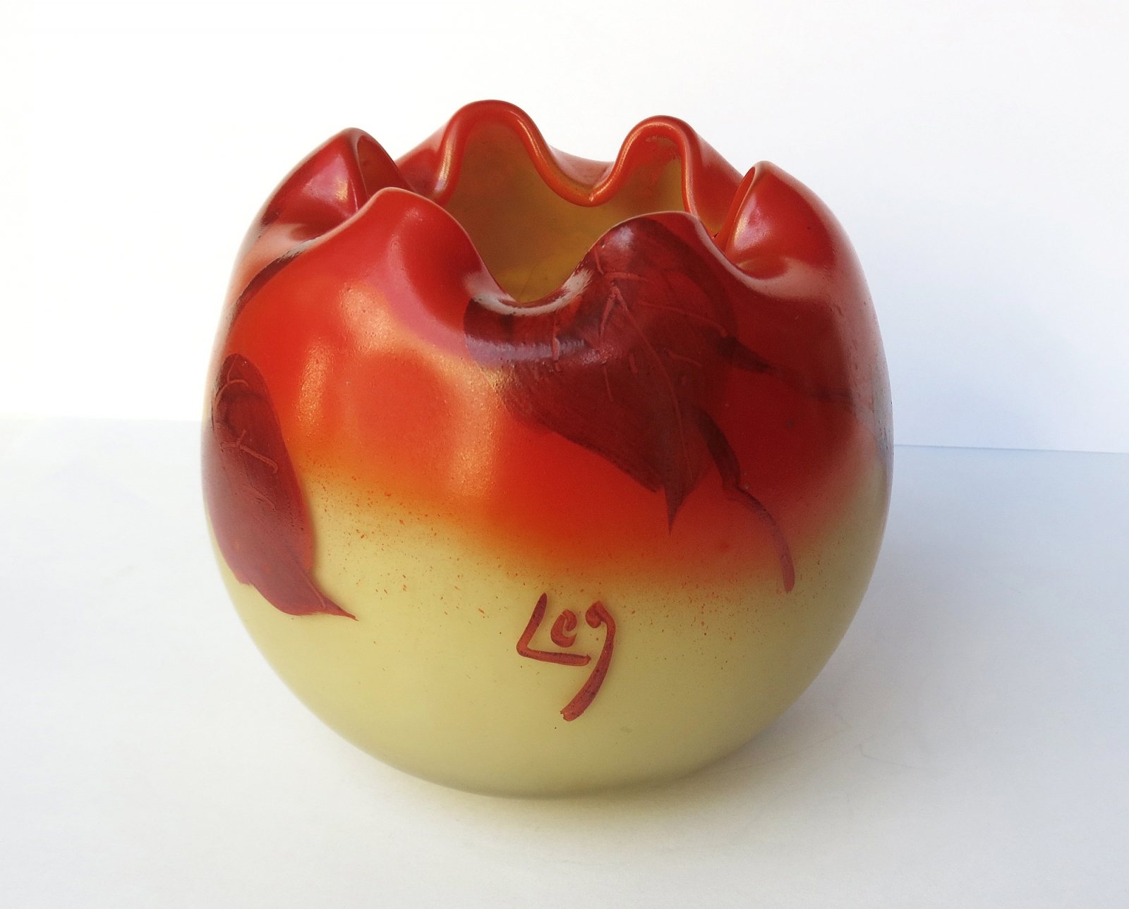 szkło bezbarwne, kremowo-żółta i pomarańczowa emalia, wys. 11 cm; kulisty korpus, sześciokrotnie wgięty do wewnątrz wylew, wew. kremowo-żółta emalia, zew. przy wylewie pomarańczowa emalia, na korpusie malowany motyw gałązki orzecha laskowego; sygn. z lat 1914-1920 ( na korpusie): Leg.