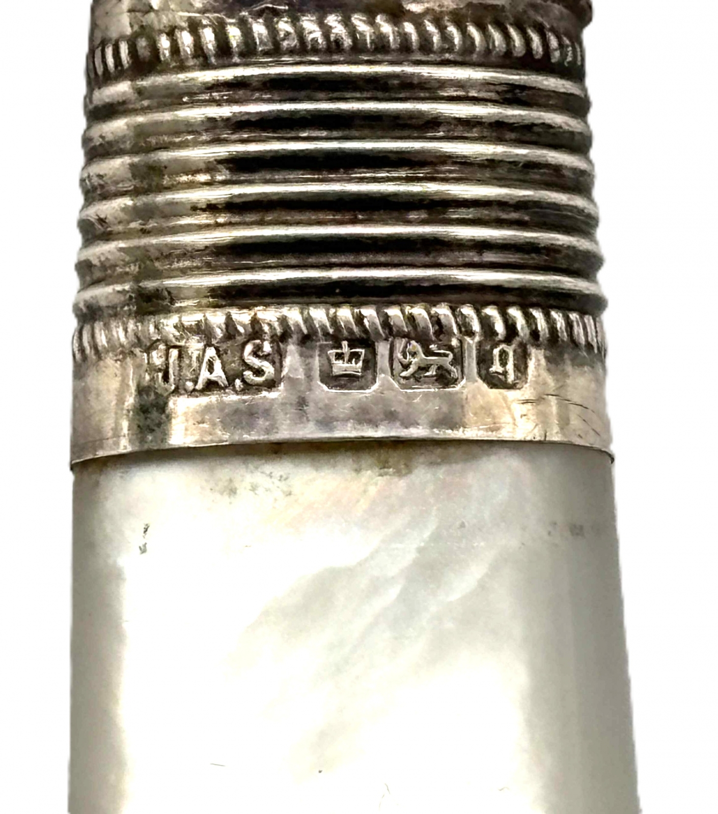 okucie metalowe, srebrna skuwka, rączka z masy perłowej