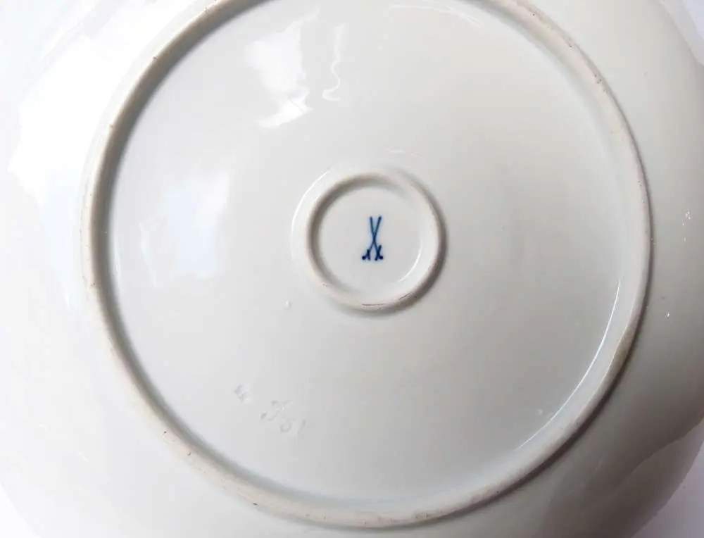 porcelana, farby naszkliwne, złocenie, śr. 29 cm; gładkie lustro dekorowane motywem bukietu barwnych kwiatów, falisty kołnierz z reliefowym motywem kratki; znak Miśni malowany kobaltem pod glazurą, wyciskane numery: 55 i 5, ryta litera J.
