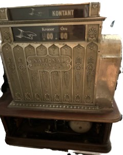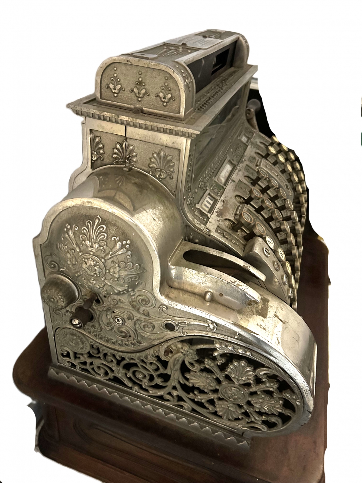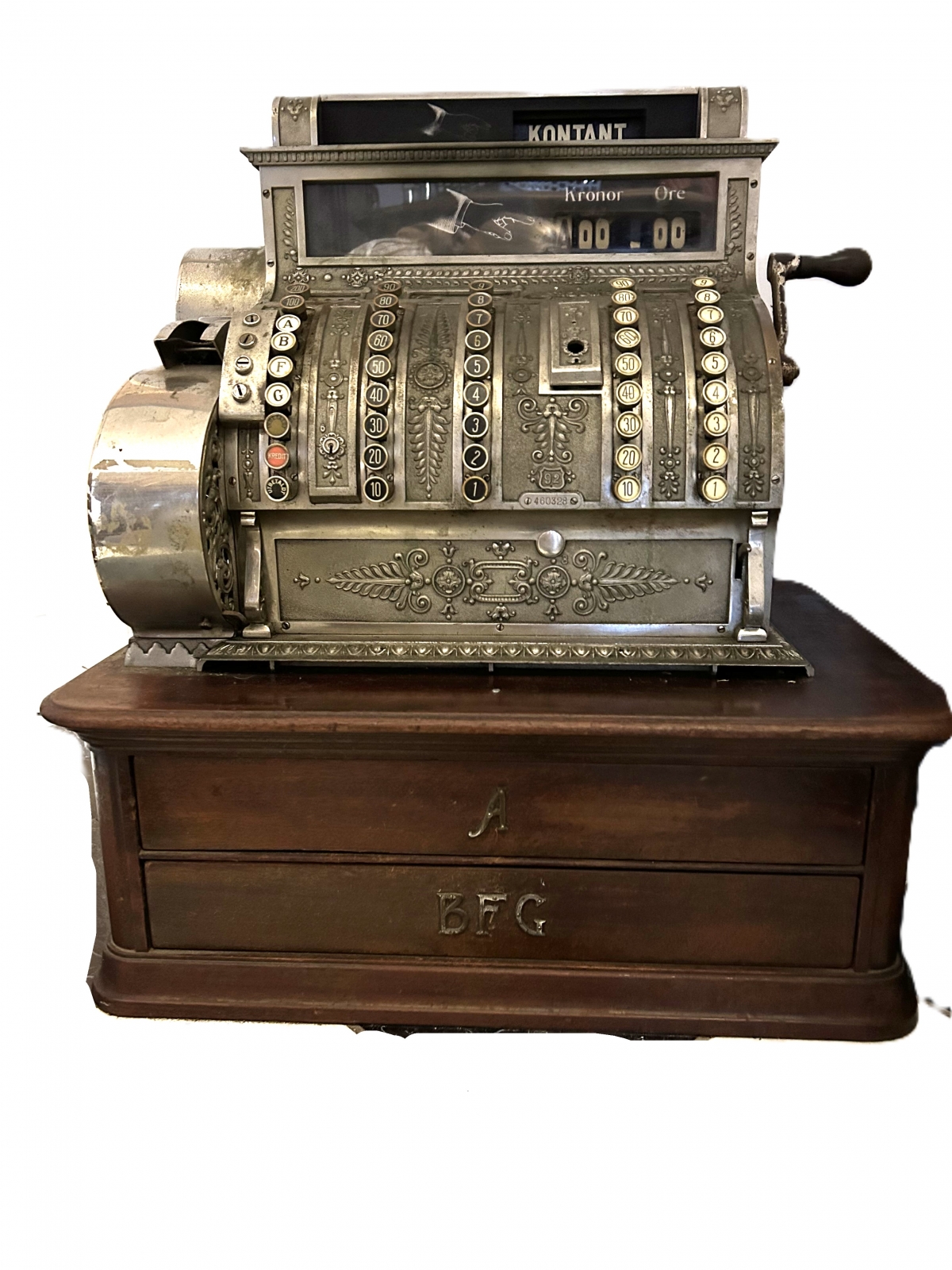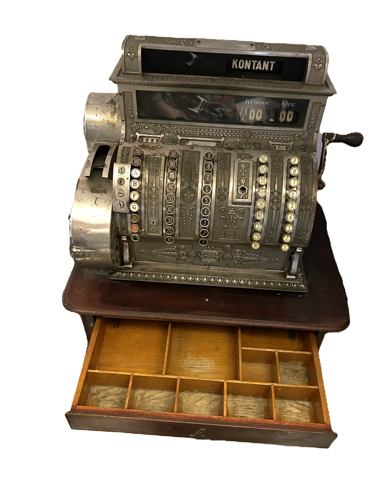 Kasa sklepowa -National Cach Recister C.o. Dayton Ohio U.S.A., metal chromowany na drewnianej podstawie z szufladą.