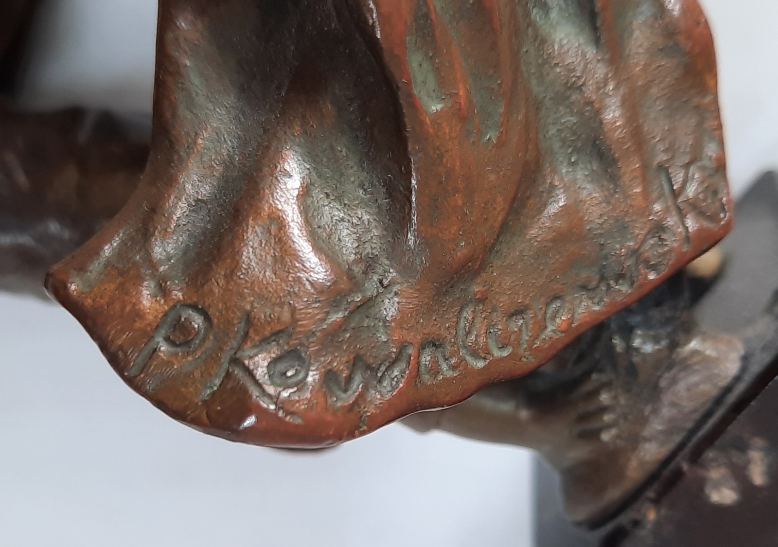 brąz patynowany,  postawa marmurowa, wys. z podstawą - 15,5 cm, wys. figury bez podstawy - 11 cm; sygn. na sukience: P. Kowalczewski