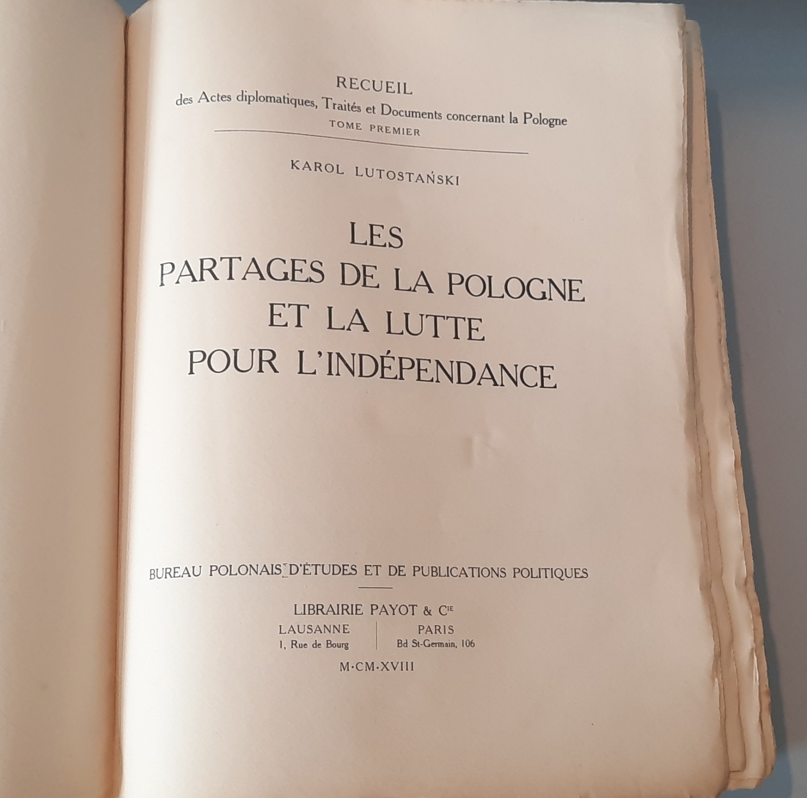 Pozycja: "Zbiór aktów dyplomatycznych, traktatów i dokumentów dotyczących Polski", Tom I - "Rozbiory Polski i walka o niepodległość", Karol Lutostański; Wydawnictwo Payot & Cie 1918 r.