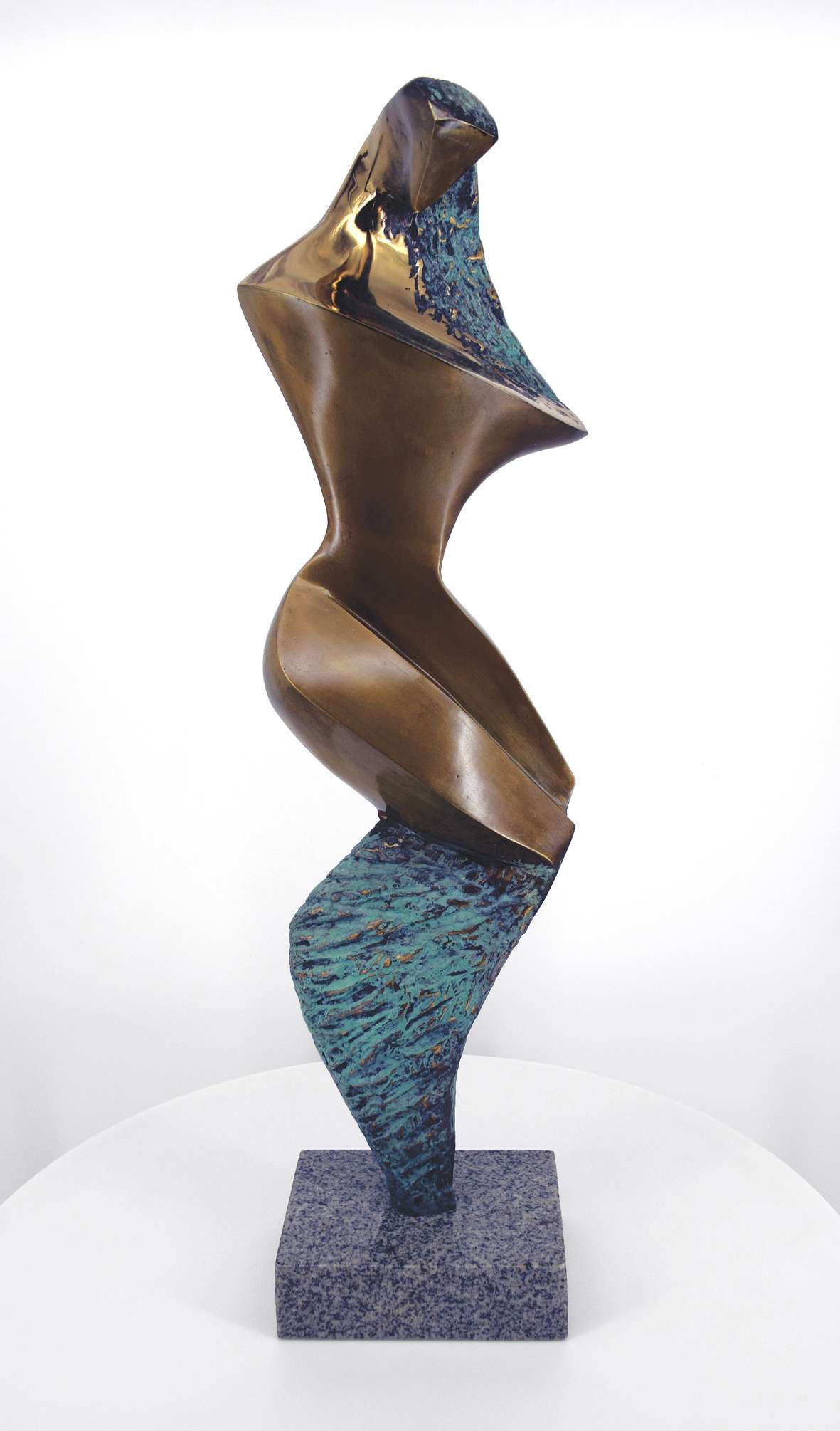 Brąz patynowany, złocony, polerowany, podstawa kamienna. Wymiary podstawy: 17 x 12,5 x 5 cm, wysokość całkowita: 70 cm, sygn. tył: "Stan Wys 3/8 2014". Pod podstawą naklejka.