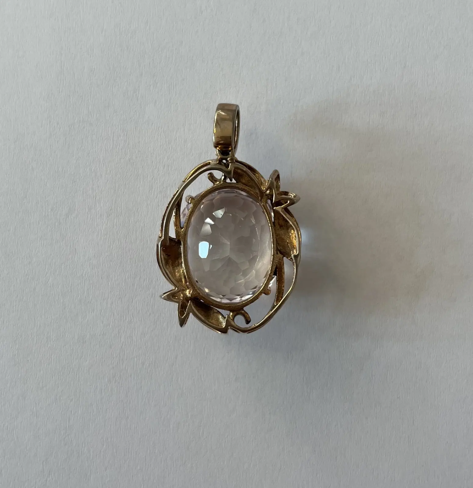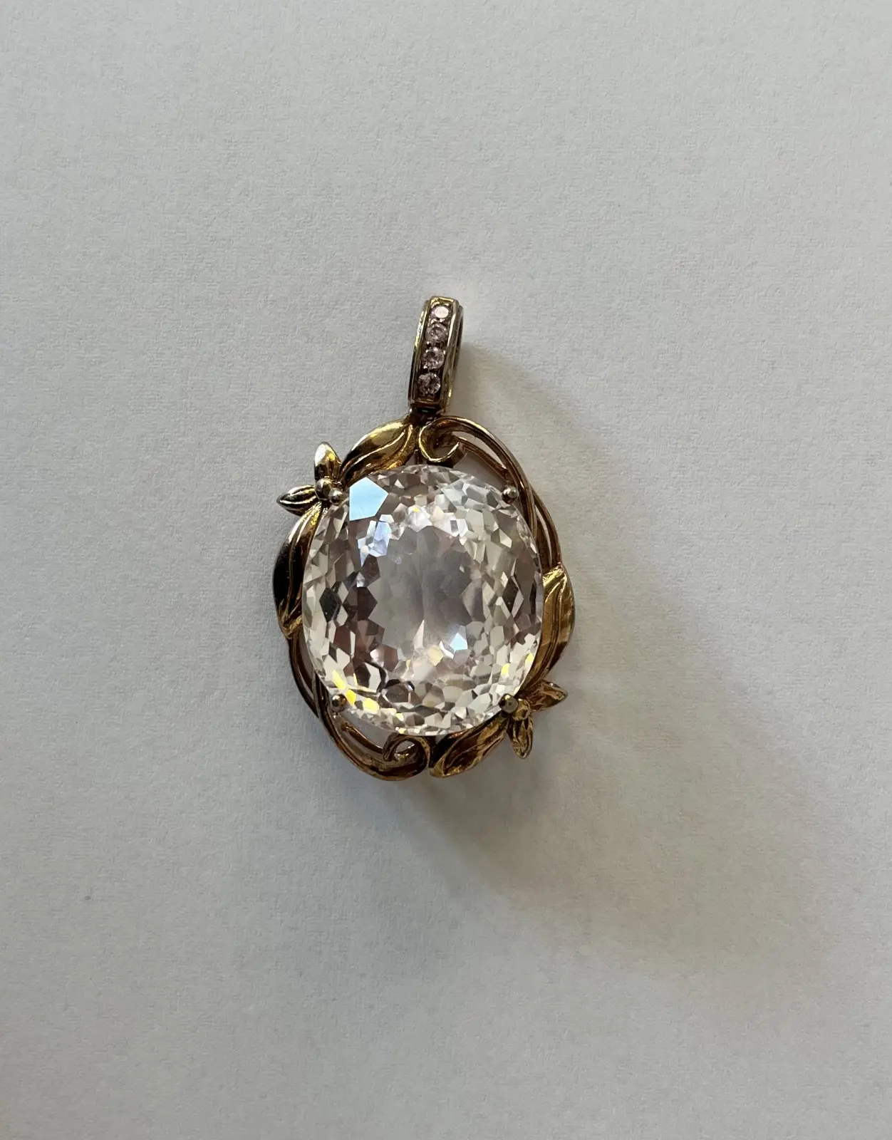 Zawieszka metal złocony, z korundem syntetycznym o szlifie owalnym/fasetowym modyfikowanym i masie 72 ct, 4 różowe cyrkonie o łącznej masie ok. 0,40 ct, waga 25,510 g. Zawieszka posiada opinię Jacka Ożdżeńskiego, rzeczoznawcy biżuterii.