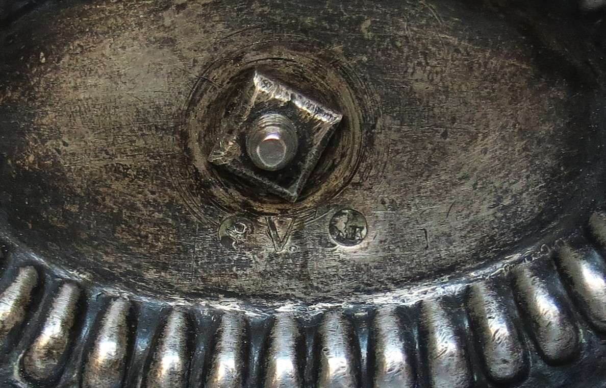 owalne stopy na 4 nóżkach kulkach, krótkie trzony z puklowanymi nodusami, owalne czarki o falistych krawędziach, dekorowanych perełkowaniem; wym.: 6,5 x 8,5 x 6,5 cm, waga 117 g, srebro pr. 12, niemieckie cechy przed 1886, monogram probierza: K, monogram drugiego probierza (po 1818): A, monogram berlińskiej firmy D. Vollgold & Söhn (rok założenia 1850). Stan zachowania: dr. wgniecenia na krawędzi stopy.