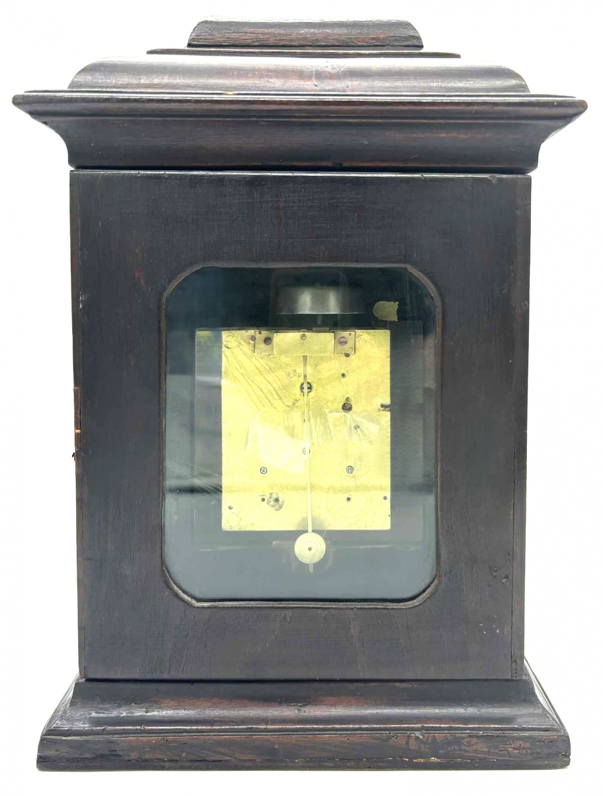 mechanizm godzinny, wychwyt szpindlowy, tarcza mosiężna, cyfry rzymskie, obudowa drewniana