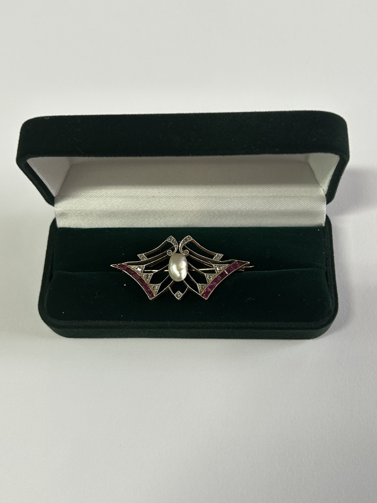 Platynowo-złota brosza z perłą, diamentami i rubinami.