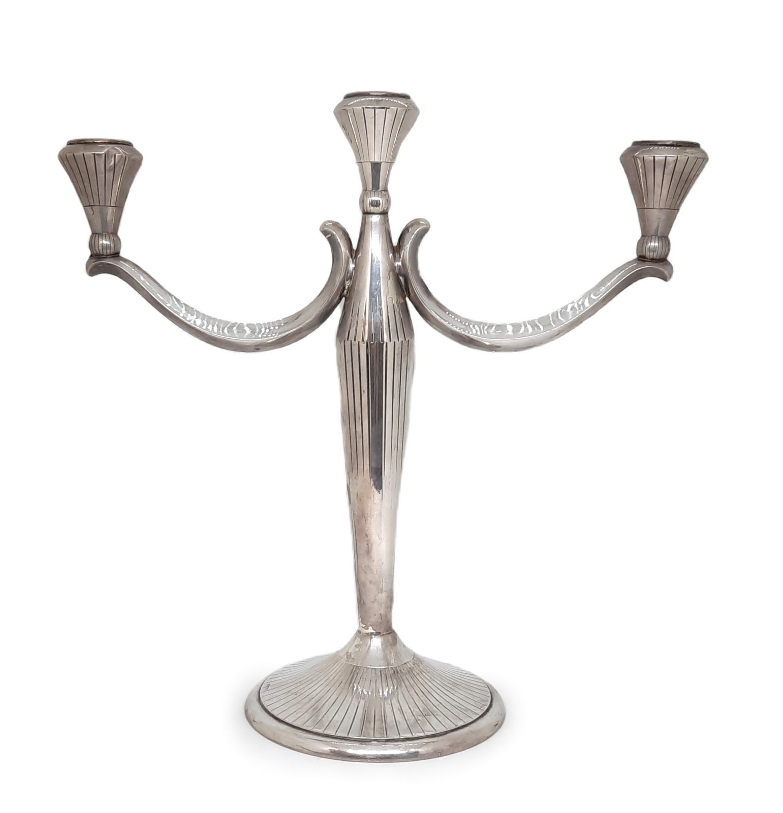 srebro pr. 835 (niemieckie cechy probiercze po 1886 r.), znak złotnika: Lutz & Weiss; masa łaczna z uwzględnionym obciążeniem: 762,5 g; stan zachowania: wgniecenie na jednym z ramion świcznika; Niemcy/Pforzheim I poł. XX w.