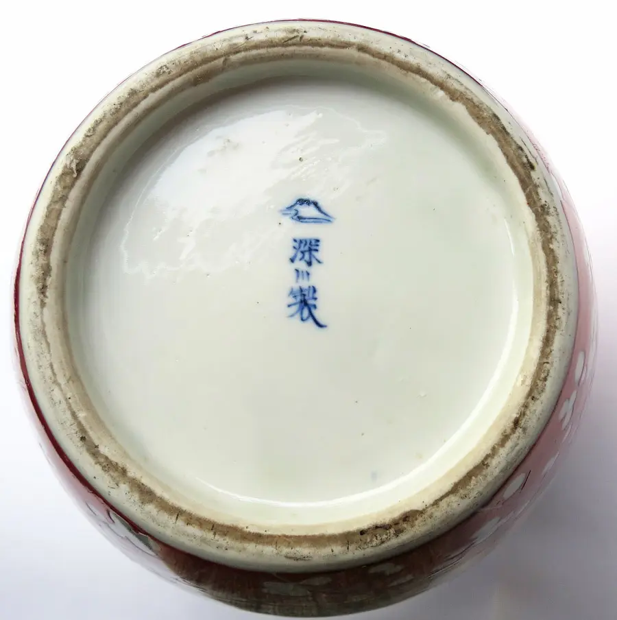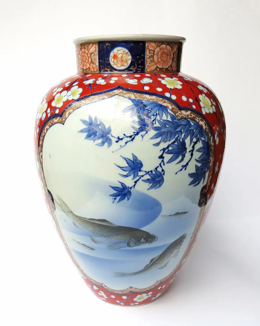 porcelana, farby podszkliwne i naszkliwne, złocenie, wys. 37 cm, śr. wylewu 15 cm; korpus dekorowany motywem kwitnącej wiśni, w dwóch medalionach motyw karpii i stylizowanych chryzantem; znak podszkliwny niebieski spółki Fukagawa Seiji: Fukagawa-sei, z lat 1900-1920. Stan zachowania d