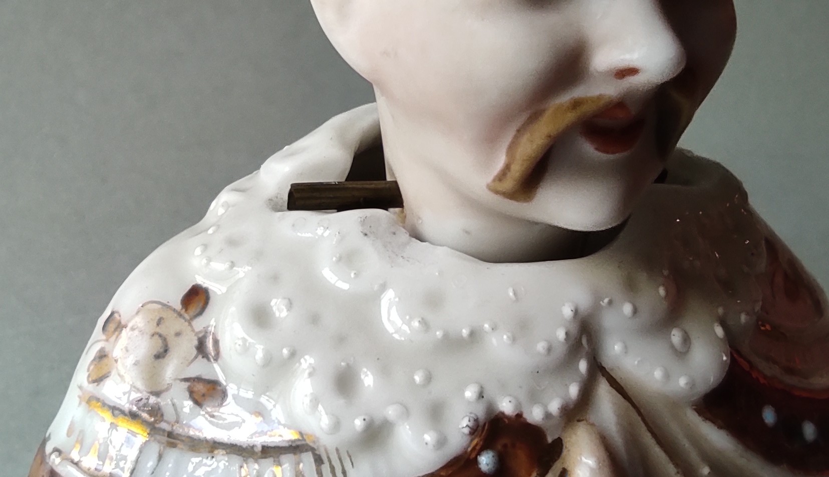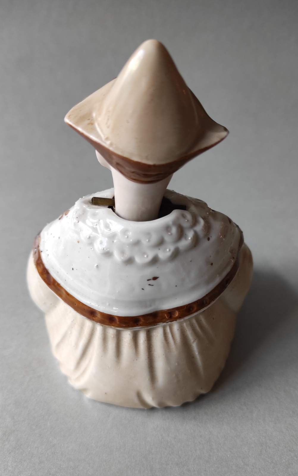 porcelana bezmarkowa, farby naszkliwne i emaliowe, złocenie; wys.10 cm. Stan zachowania: b.drobne ubytki przy krawędzi podstawy i kołnierza szaty.