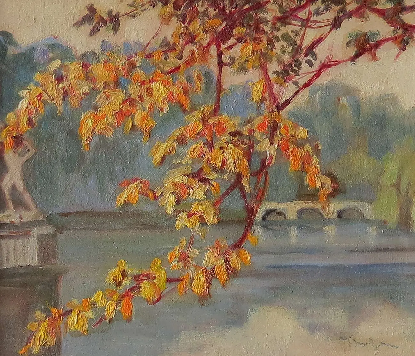 olej, tektura, 22 x 26 cm, sygn. p.d.: JBudzyn Na odwrocie autorski (?) opis atramentem: Widok z pałacu Łazienkowskiego w Warszawie, oraz dwa stemple autorskie: Wykonał / Budzynowski Józef.
