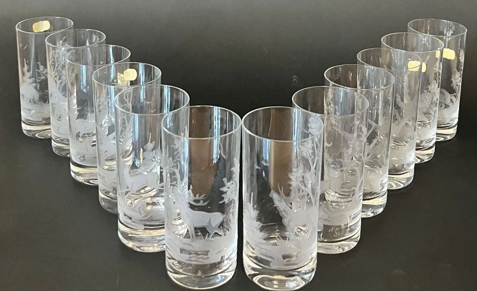Zestaw 12 szklanek z motywem myśliwskim,  kryształ ołowiowy, cięty ręcznie.