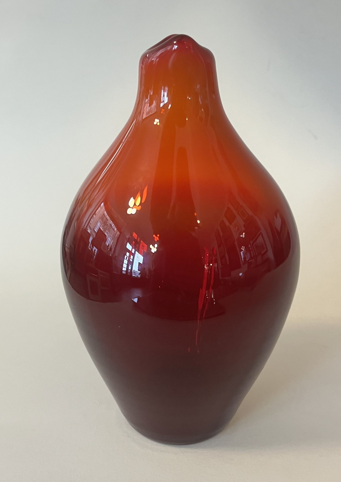 Wazon z zestawu "Rogacz" tzw. "Rybie usta", szkło sodowe, barwione w masie, wys. 18 cm. Stan zachowania bardzo dobry. Projekt: Zbigniew Horbowy (Huta Szkła Gospodarczego "Sudety" w Szczytnej Śląskiej)
