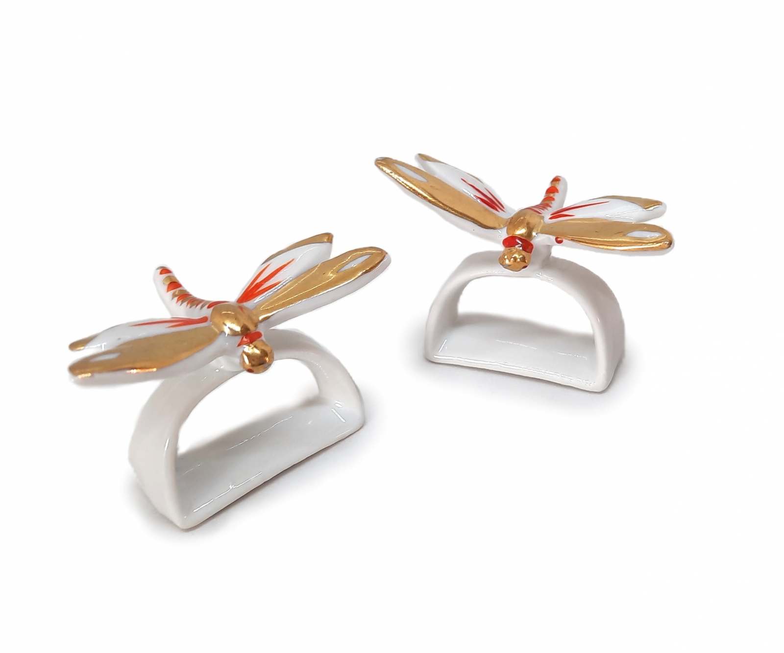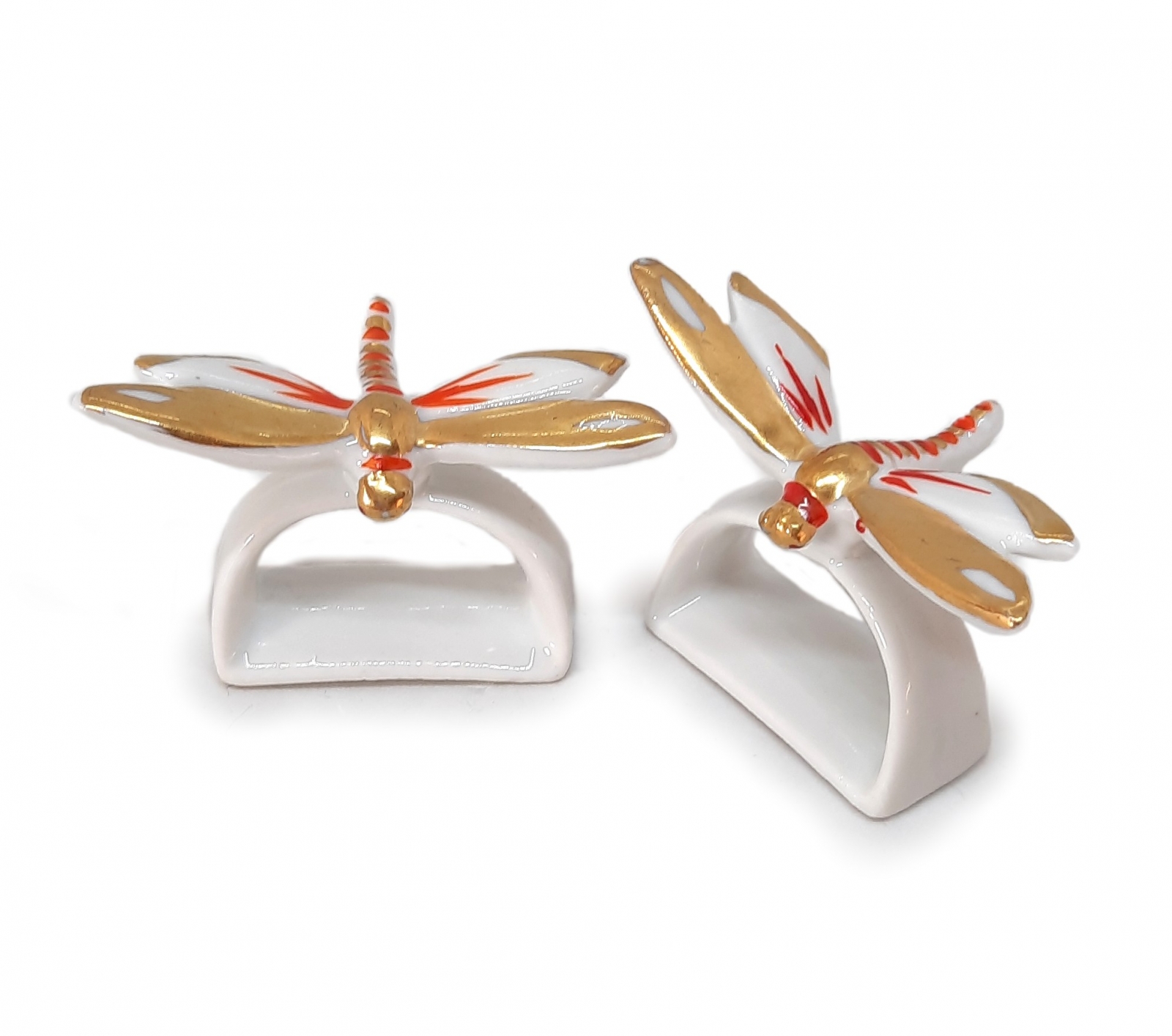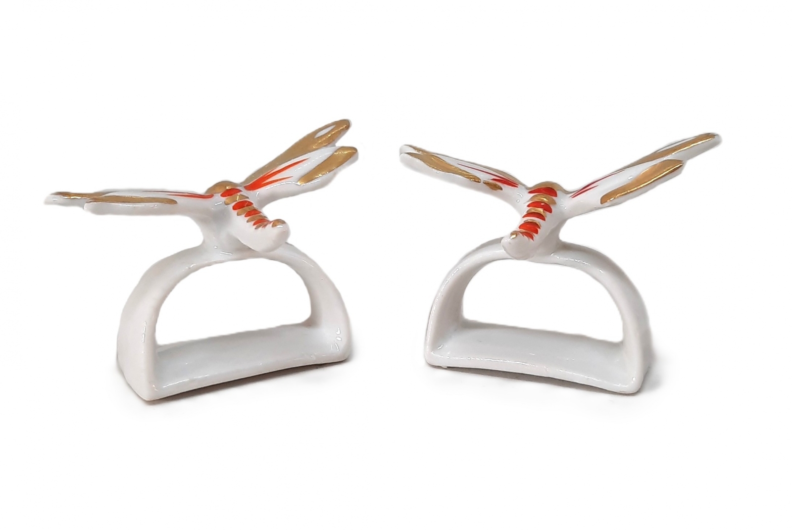 ceramika szkliwiona, malowana, złocona; serwetniki niesygnowane; wys. 4 cm; stan zachowania: pęknięcie w masie jednego z serwetnika; XX w. (?)