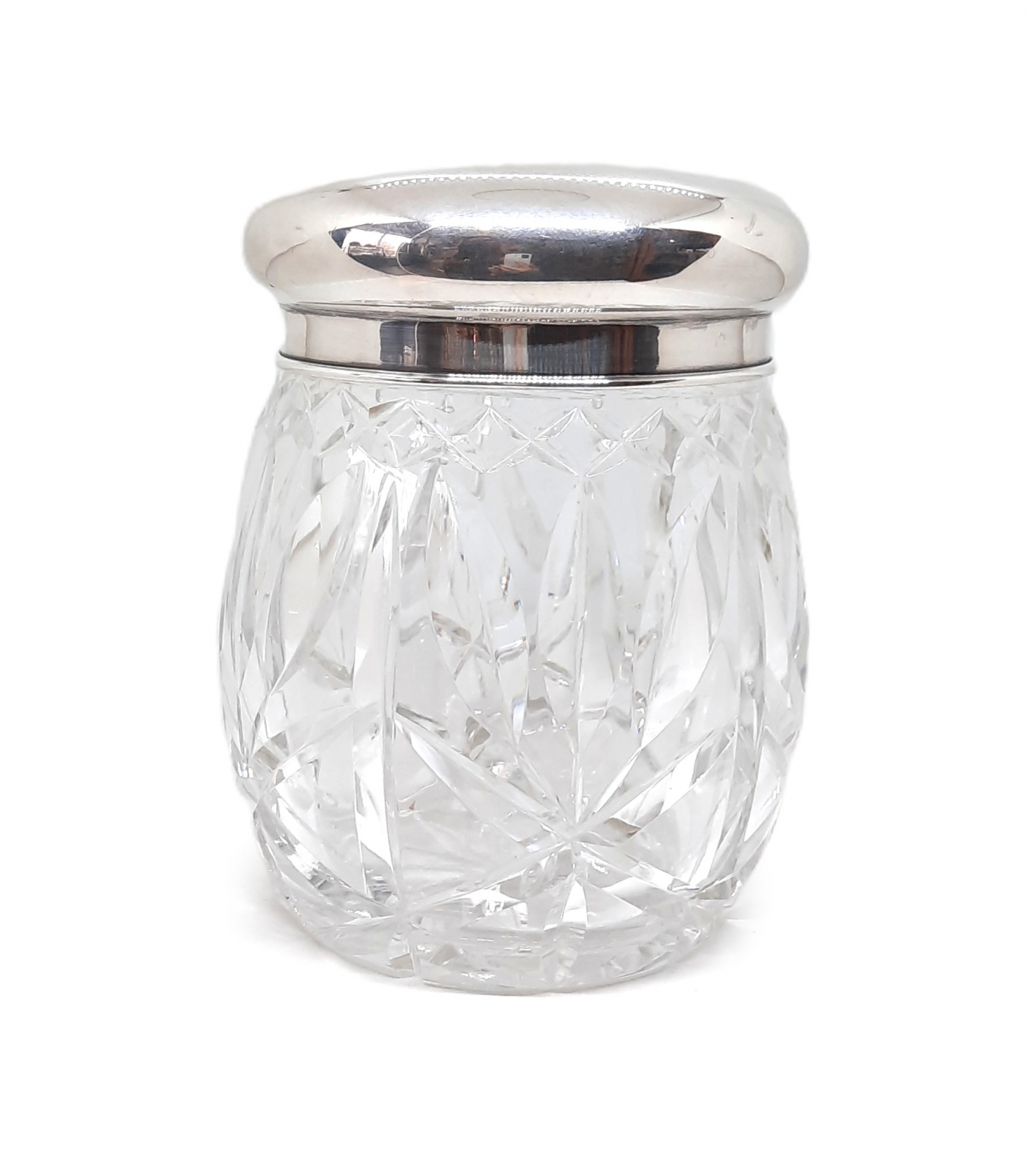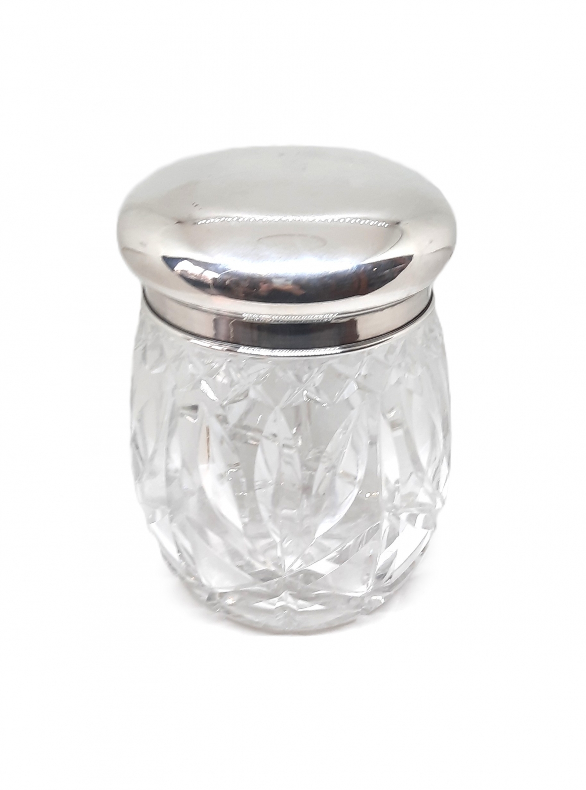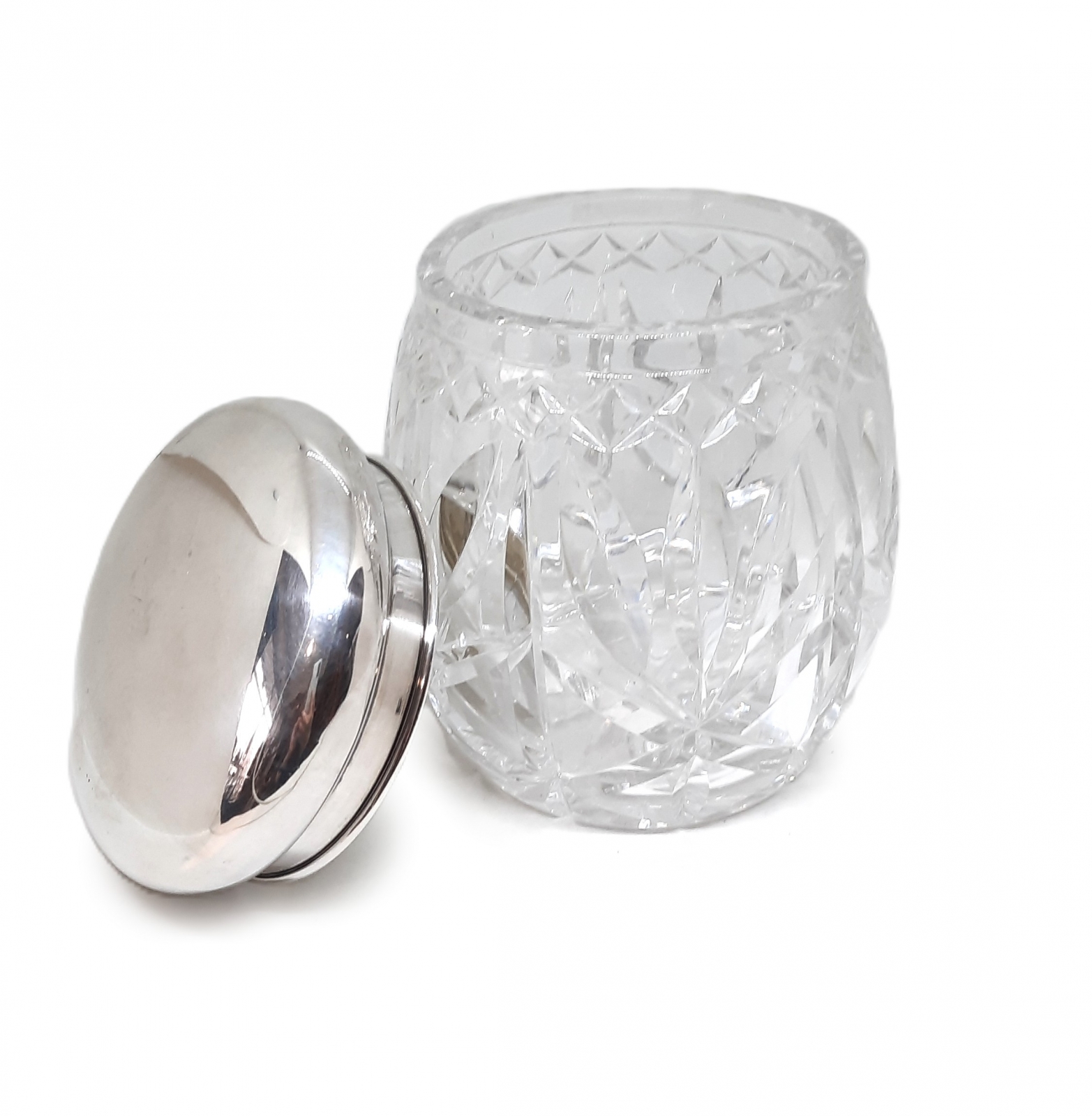 szkło kryształowe szlifowane / pokrywka srebrna pr. 835, znak złotnika - Gebrüder Kühn (czynny od 1860 roku); masa pokrywki - 114 g; wymiary: wys. 17 cm, szer. ok. 14 cm; Niemcy, Schwäbisch Gmünd, Gebrüder Kühn, XX w.