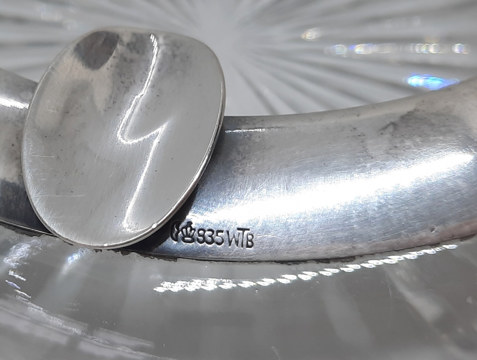 szkło bezbarwne szklifowane / srebro pr. 835; znak złotnika 'WTB' - Wilhelm Binder (czynny od 1869 r.); śr. 16 cm; stan zachowania: ślady użytkowania; Niemcy / Schwäbisch Gmünd  I poł. XX w.
