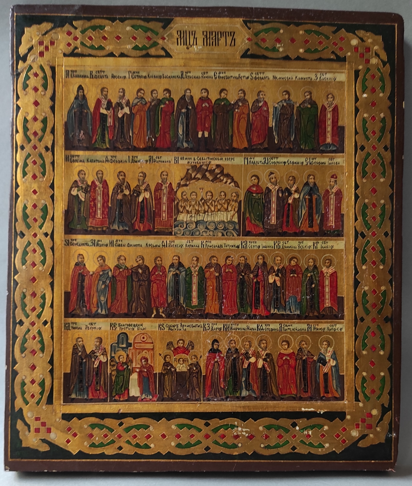 tempera, złocenie, deska; 31 x 26,5 cm;  Ikonograficzne przedstawienie prawosławnego kalendarza liturgicznego na marzec. Stan zachowania: deska pęknięta, po konserwacji.