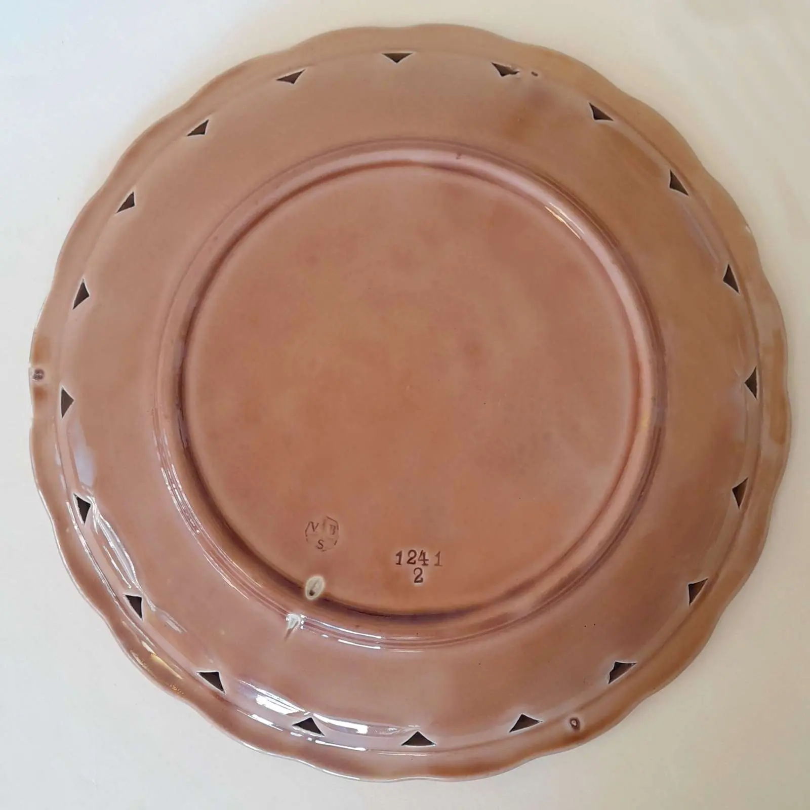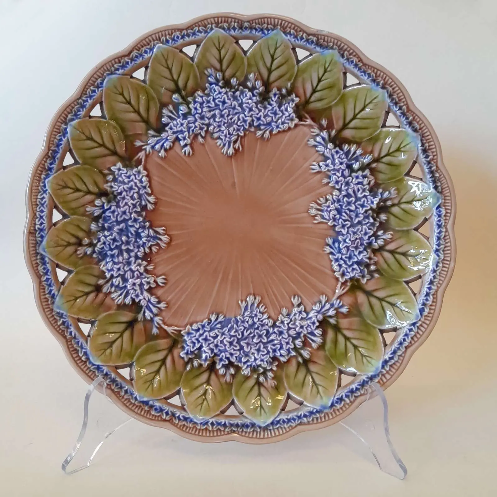 Majolika zdobiona plastycznym motywem kwiatów bzu , średnica 29 cm , sygn. Villeroy & Boch z lat  1883-1900.