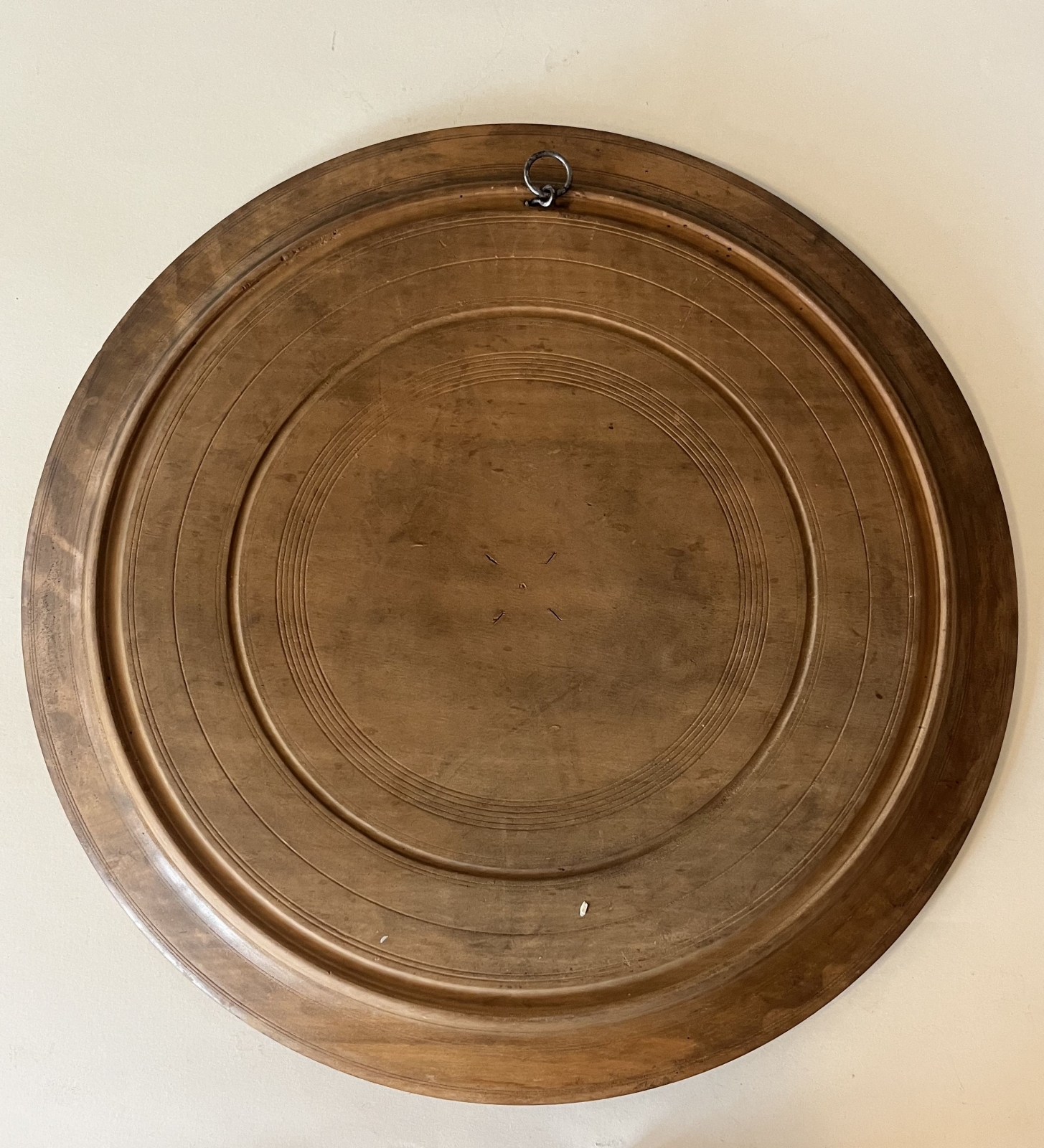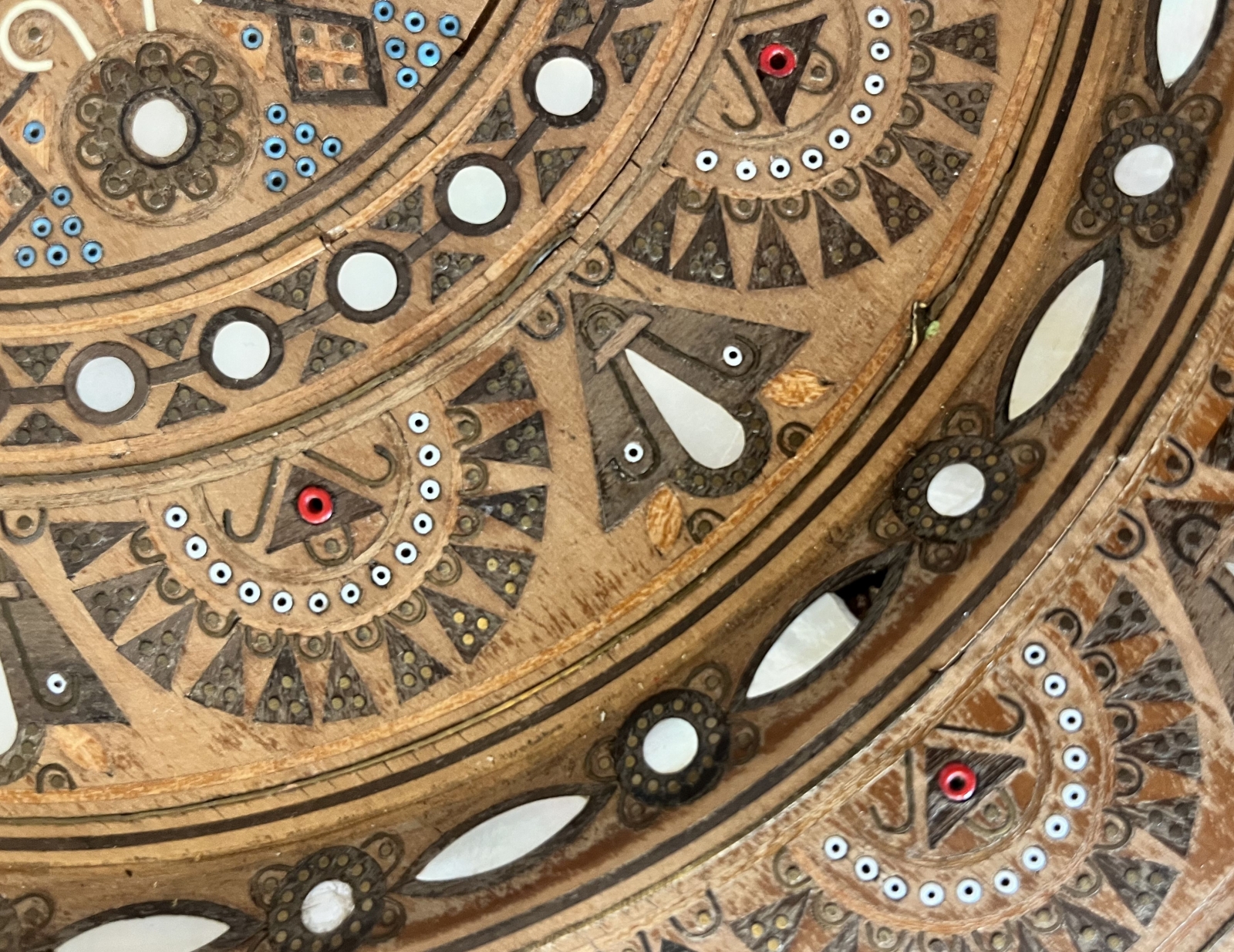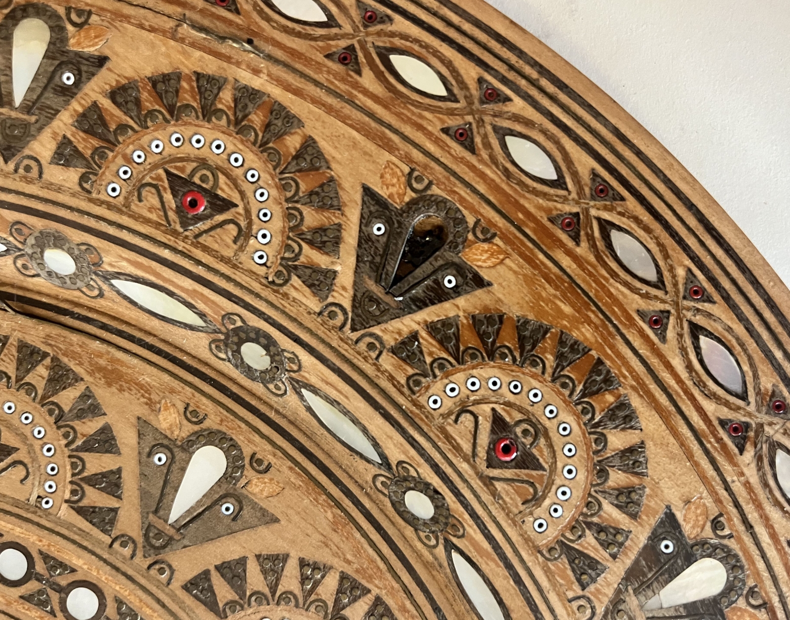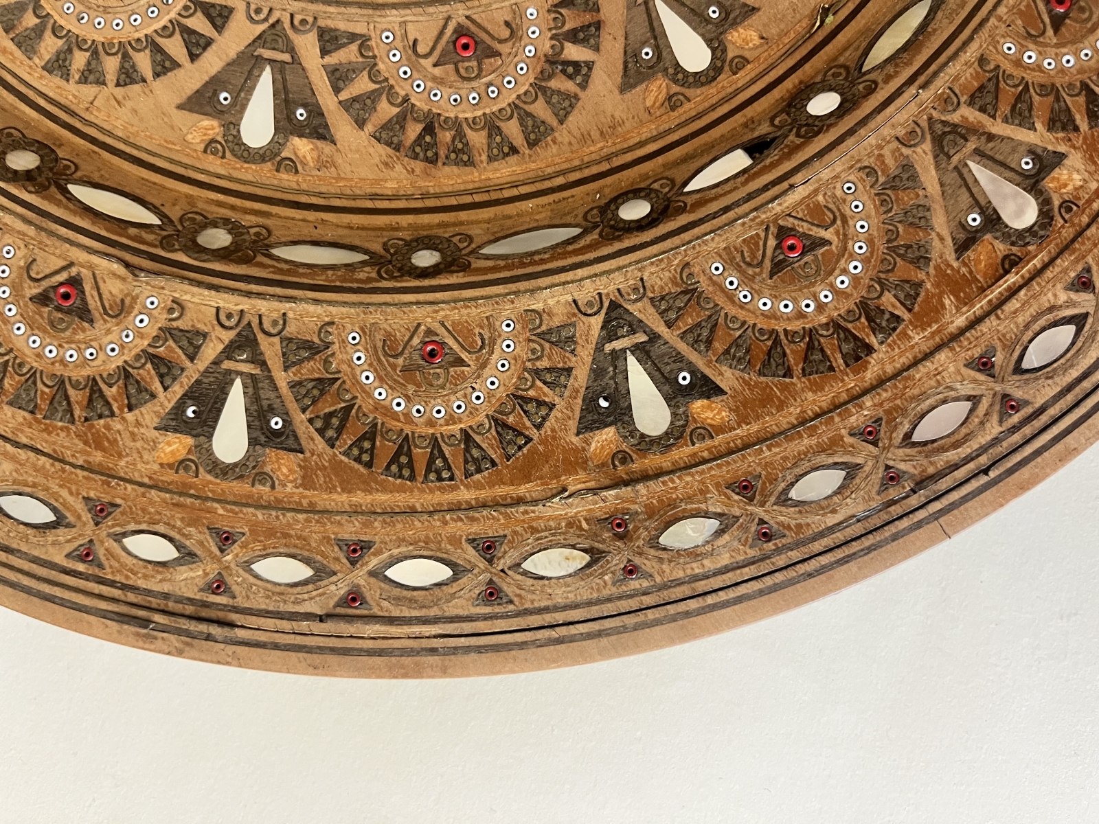 Talerz drewniany inkrustowany masą perłową, koralikami i nitką mosiężną. Śred. 41 cm, stan: brak jednego elementu z masy perłowej, uszkodzenie jednego elementu z masy perłowej, uszkodzenia nitki mosiężnej, zarysowania (widoczne na zdjęciach)