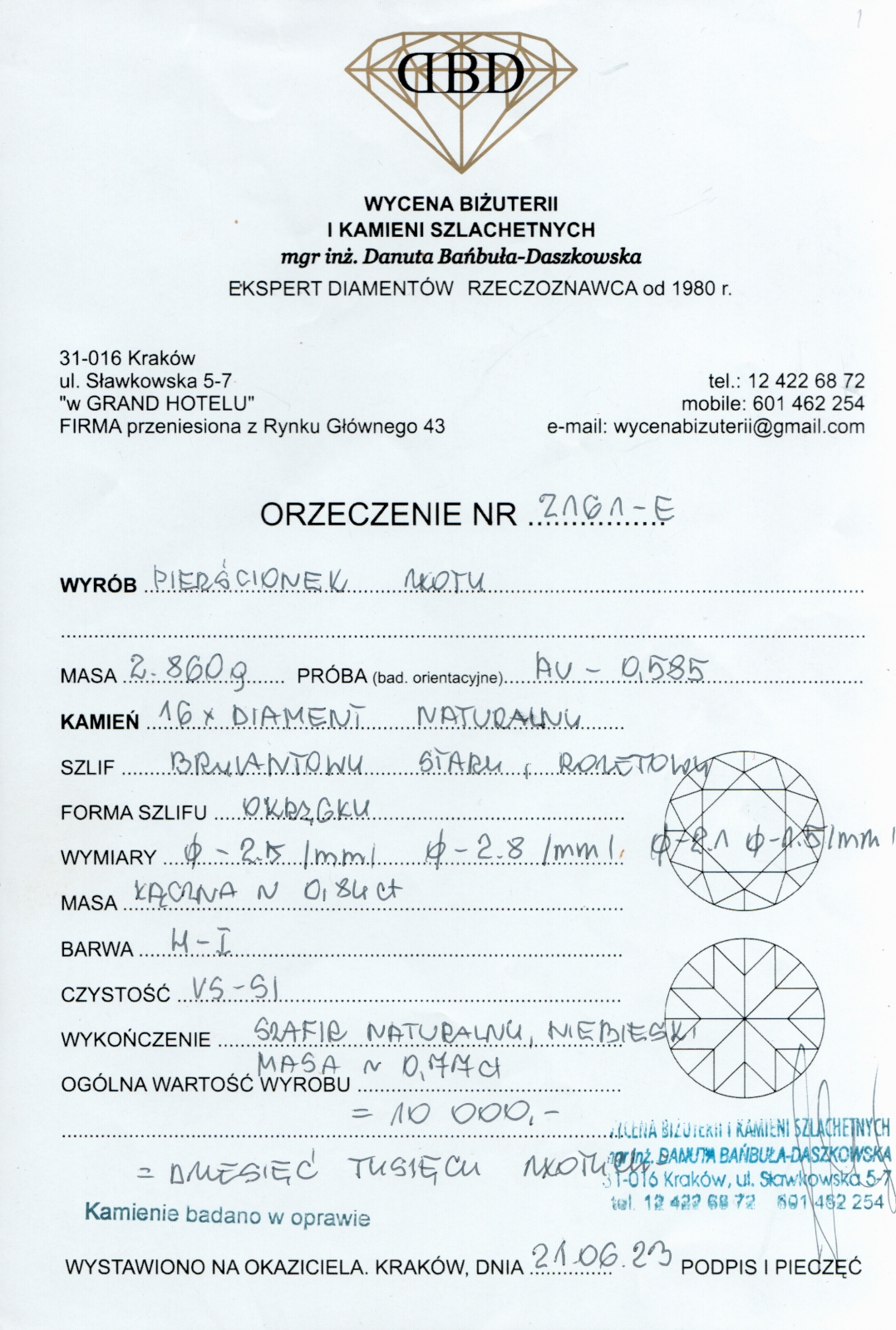 barwa i czystość: H-I/VS-SI