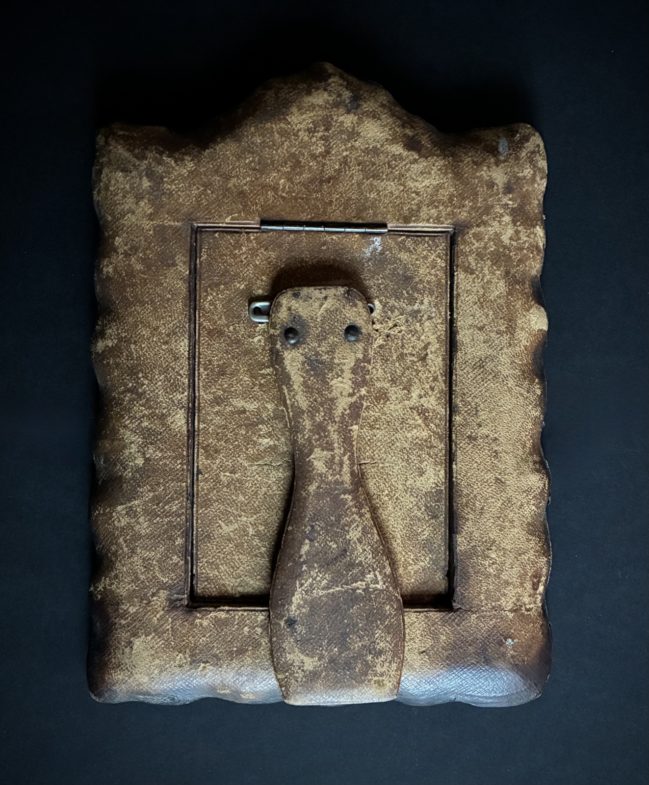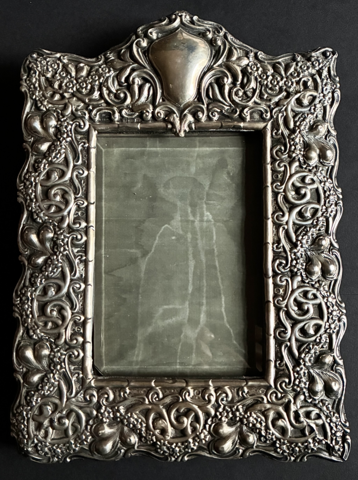 Ramka srebro pr. 925 , Birmingham, znak firmy M.Bro ( Miller Brothers) szkiełko fazowane - róg ubity, wykończenie skóra, 27 x 19 cm, początek XX wieku.