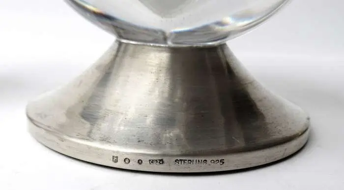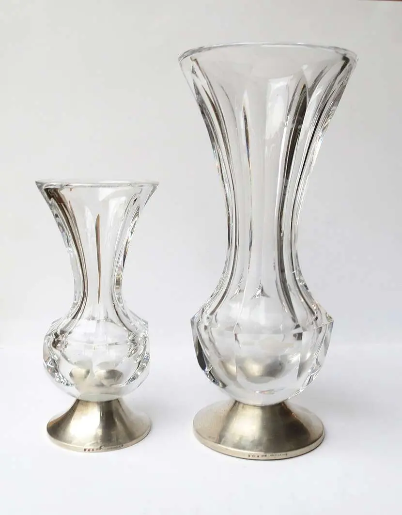 srebrne koliste stopy, korpusy z bezbarwnego, szlifowanego szkła wys.: 17 cm i 24,5 cm; srebro pr. 0,925, holenderskie cechy po 1953, urzędy probiercze w Amsterdamie (wyższy wazon) i w s'Hertogenbosch, litera datująca A (1985), monogram złotnika : CBZ* (C. Bos and Zoon B.V., s'Hertogenbosch).