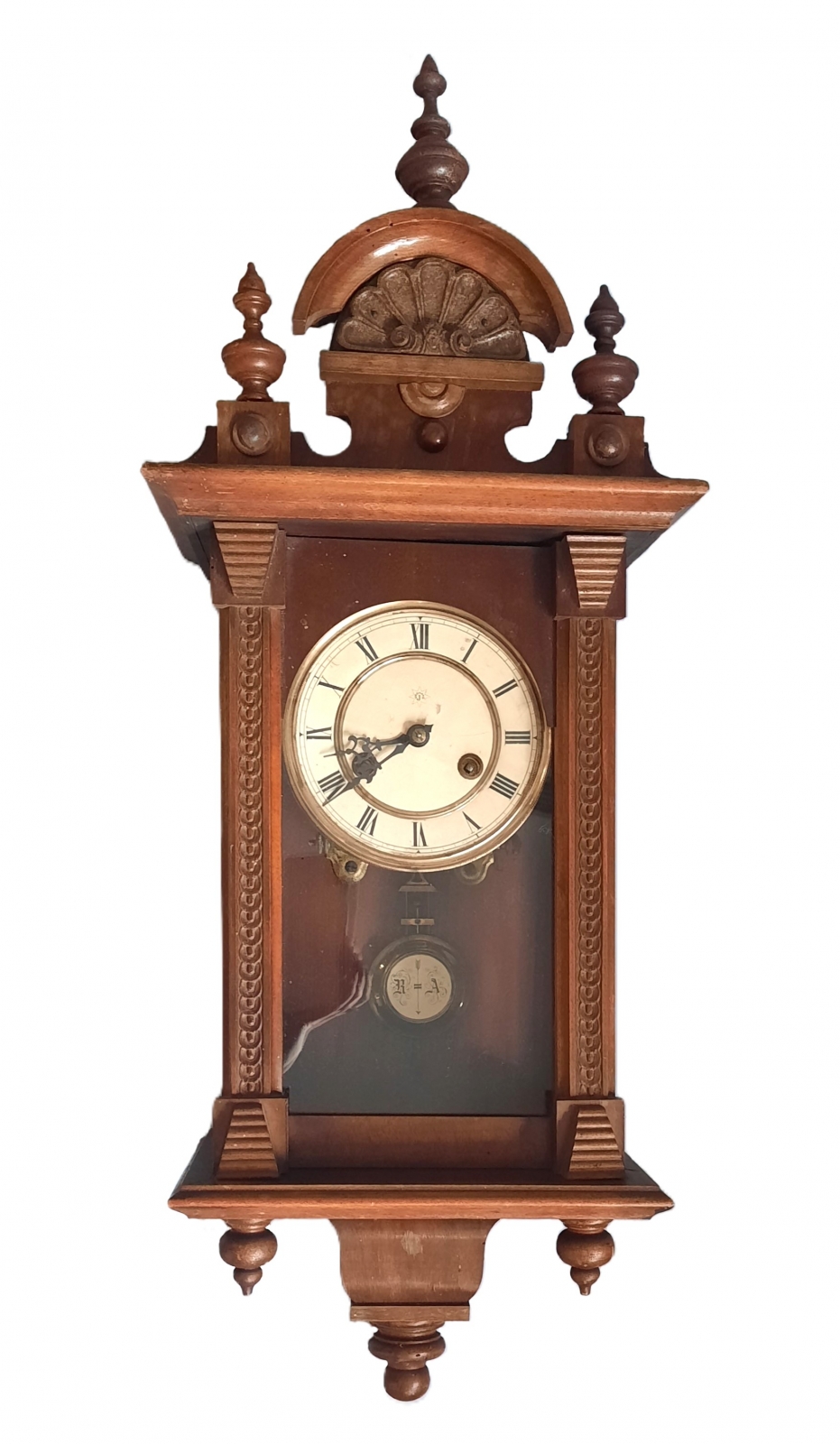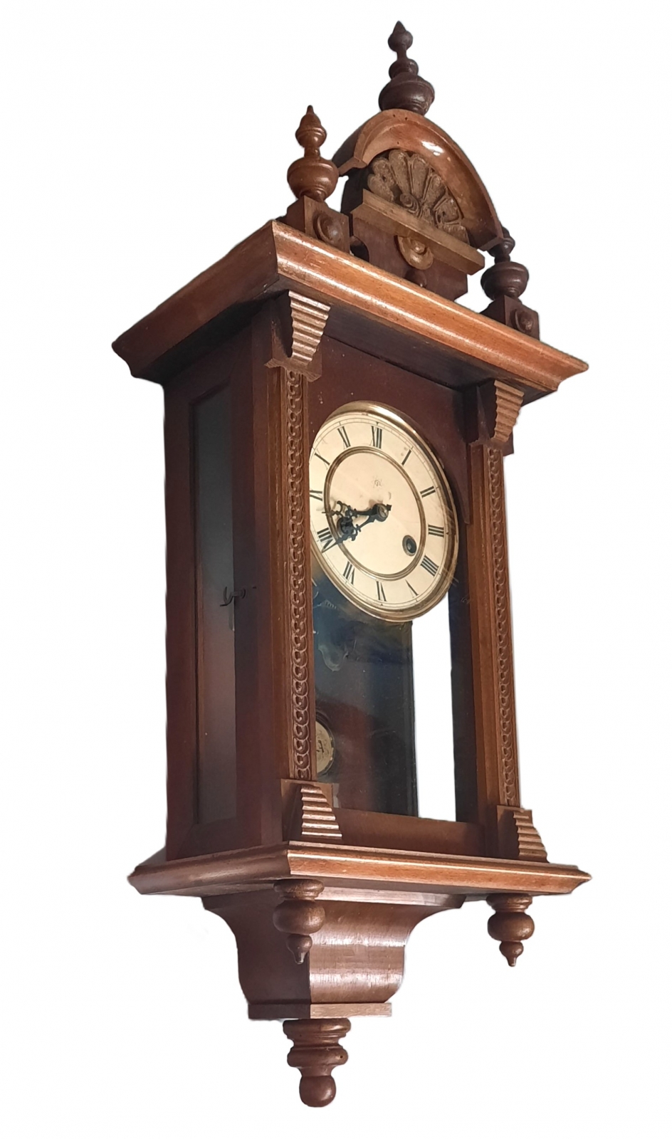 drewno, mosiądz; wymiary skrzynki: dł. 71 cm, szer.27 cm, gł. 18 cm; tarcza z cyframi rzymskimi; gong spiralny, wahadło mosiężne; stan zachowania: mechanizm do regulacji; Niemcy I poł. XX w.