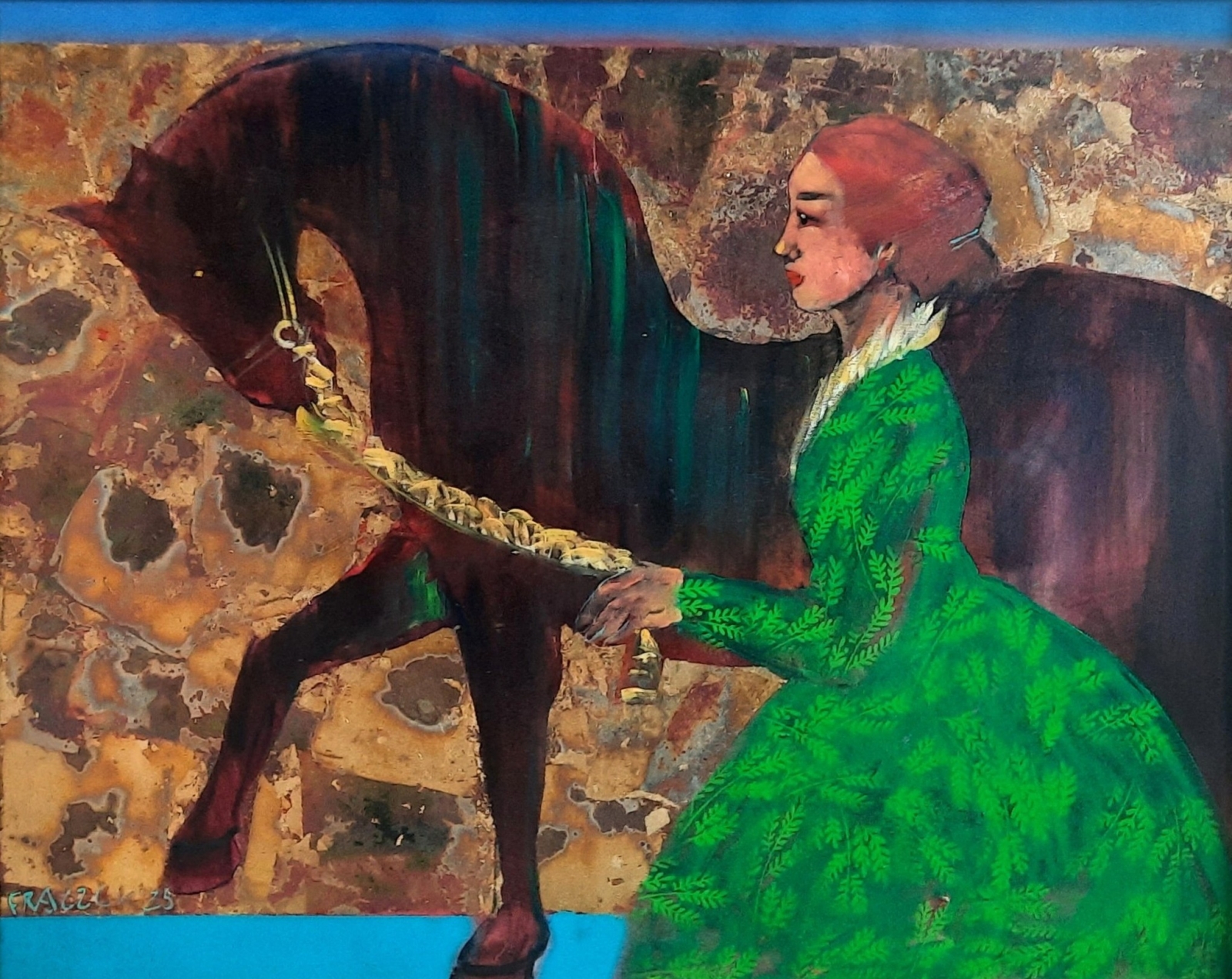 akryl / metal / płótno, wym. 80 cm x 100 cm, sygn. l.d. Frączek 25; opisany autorsko na odwrocie: Bartosz Frączek / Księżniczka z rumakiem / akryl x metal x płótno / 80 x 100 / 2025; oprawa listwowa, materiałowe passe-partout