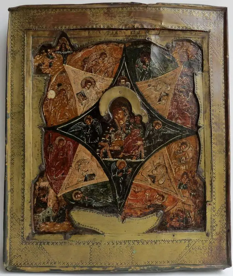 ikona, tempera, deska, 30 x 25 cm, okład (basma) blacha mosiężna sztancowana. Stan zachowania: blacha z dr. wgnieceniami i pęknięciami, brak szpong.