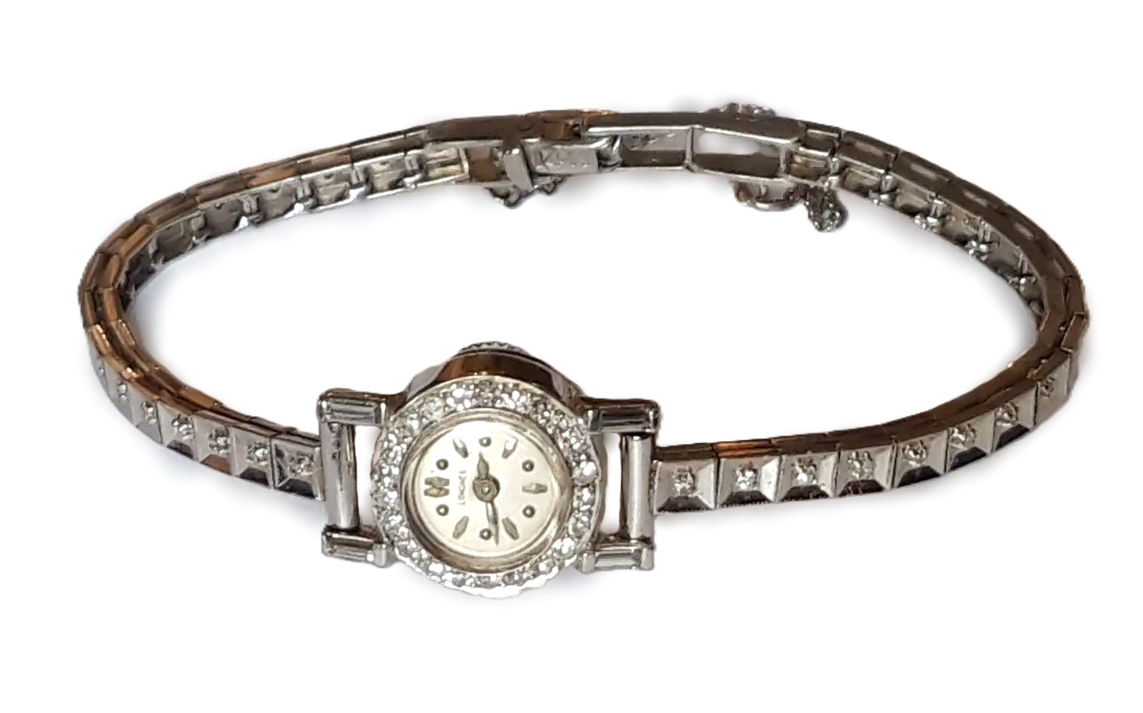 zagraniczna próba złota: bransoletka - 14K, koperta - 18K; 58 szt. diamentów w tym 54 szt. około 0,46 ct, w szlifie diamentowym 8/8, w barwie: G-H i czystości VS-SI oraz 4 szt. diamentów około 0,16 ct w szlifie bagiet, w barwie: G i czystości VS; masa zegarka bez mechanizmu - 10,9 g, masa łączna - 12,45 g; stan zachowania - mechnizm zegarka do przeglądu zegarmistrzowskiego; Szwajcaria lata 60-te XX w.
