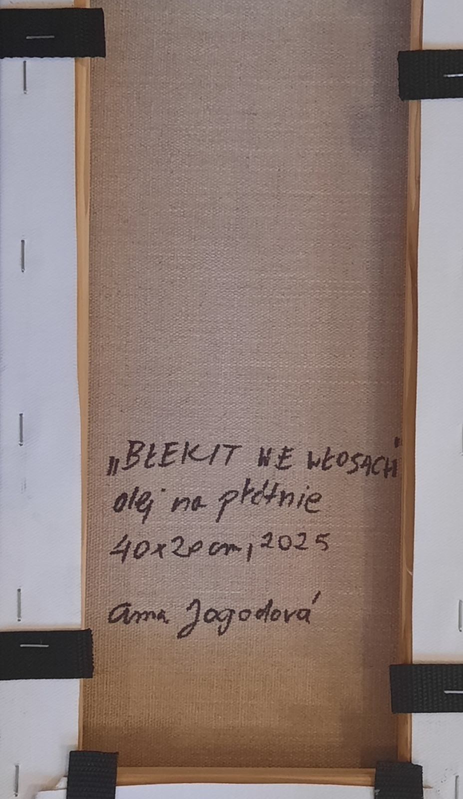 olej / płótno, wym. 40 cm x 20 cm, sygn. p.d. 'A. Jagodova '2025'; oprawa listwowa, materiałowe passe-partout; opisany autorsko na odwrocie: ' "Błękit we włosach" / olej na płótnie / 40 x 20 cm, 2025 / Anna Jagodova '