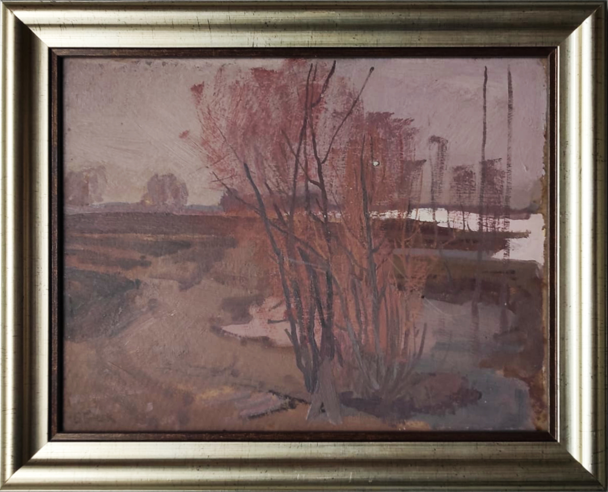 na odwrocie słabo czytelna pieczęć i naklejka z wystawy Towarzystwa Przyjaciół sztuk Pięknych w Krakowie nr 1185: Autor Gałek Stanisław / Adres: Szczepanów / Dzieło: Szare pola / Rodzaj: ol. cena: 200.K.