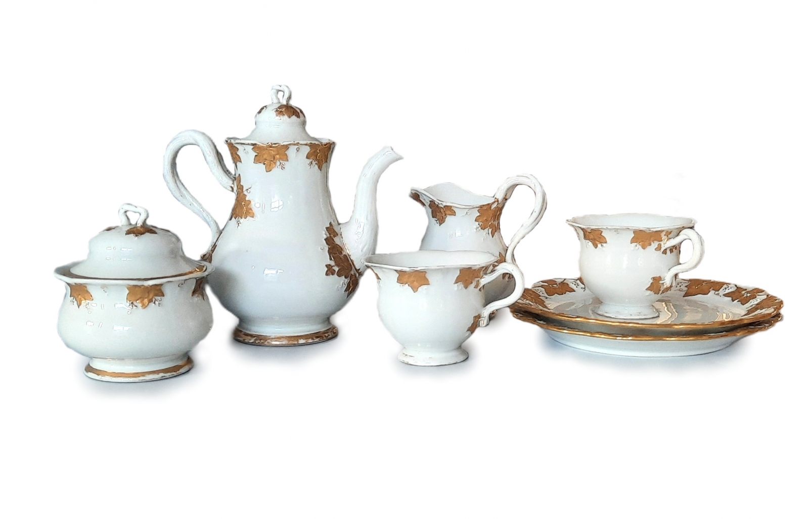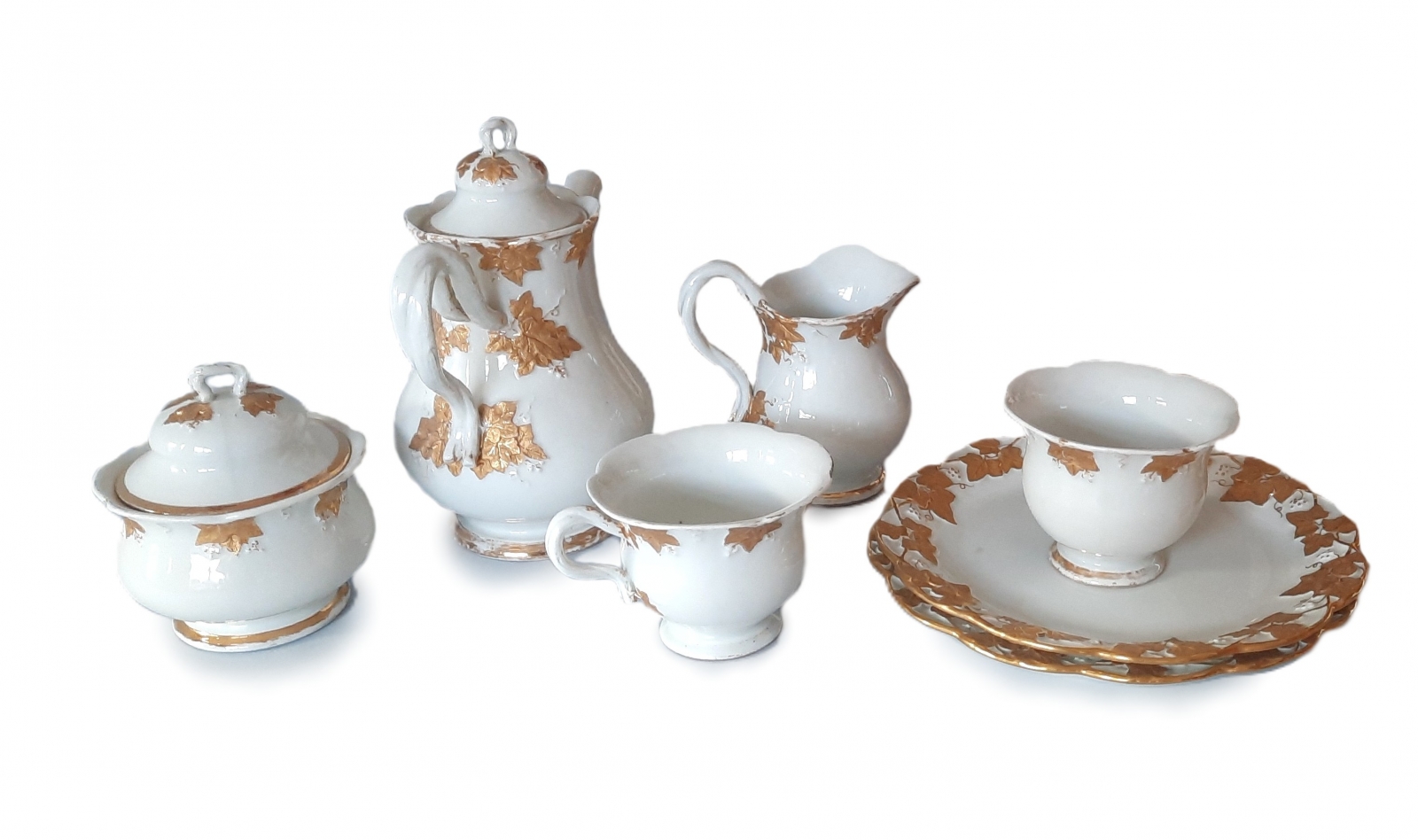 dobierany; skład zestawu (7 elementów): dzbanek -  1 szt., cukiernica - 1 szt., mlecznik - 1 szt., talerzyki deserowe - 2 szt., filiżanki bez spodków - 2 szt.; sygnatura kobaltowa podszkliwna: dwa skrzyżowane miecze, dodatkowo kobaltem wypisane numery; dekoracja reliefowa, złocona w formie liści winogron; stan zachowania - zestaw dobierany: talerzyki deserowe z sygnaturą z lat 1924-1934; delikatne przetarcia złoceń; Miśnia/Niemcy/Saksonia XIX/XX w. oraz I poł. XX w.