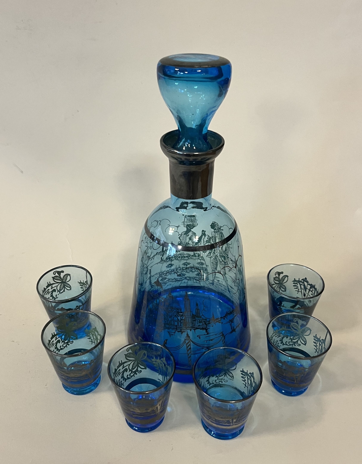 Niebieskie szkło weneckie, srebro galwaniczne, zdobione motywami z Wenecji ( tańcząca para, pejzaż wenecki oraz Bazylika Świętego Marka) na kieliszkach motyw gondoli. Wysokość karafki 22,5 cm,  kieliszków 5,5 cm. Drobne wyszczerbenia rantów kieliszków. Włochy, I poł. XX wieku.