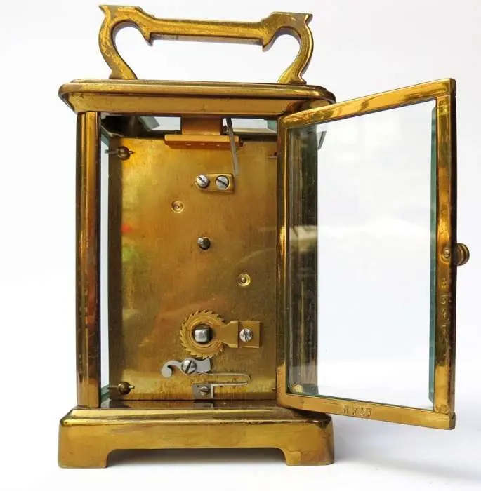 mechanizm niesygnowany, emaliowana biała tarcza z cyframi rzymskimi, obudowa mosiądz złocony, ścianki i daszek wypełnione fazowanymi szybkami, pałąk na zawiasach, na drzwiczkach wybity numer B 347, wym. 14 x 8 x 6,5 cm. Stan zachowania: brak kluczyka.