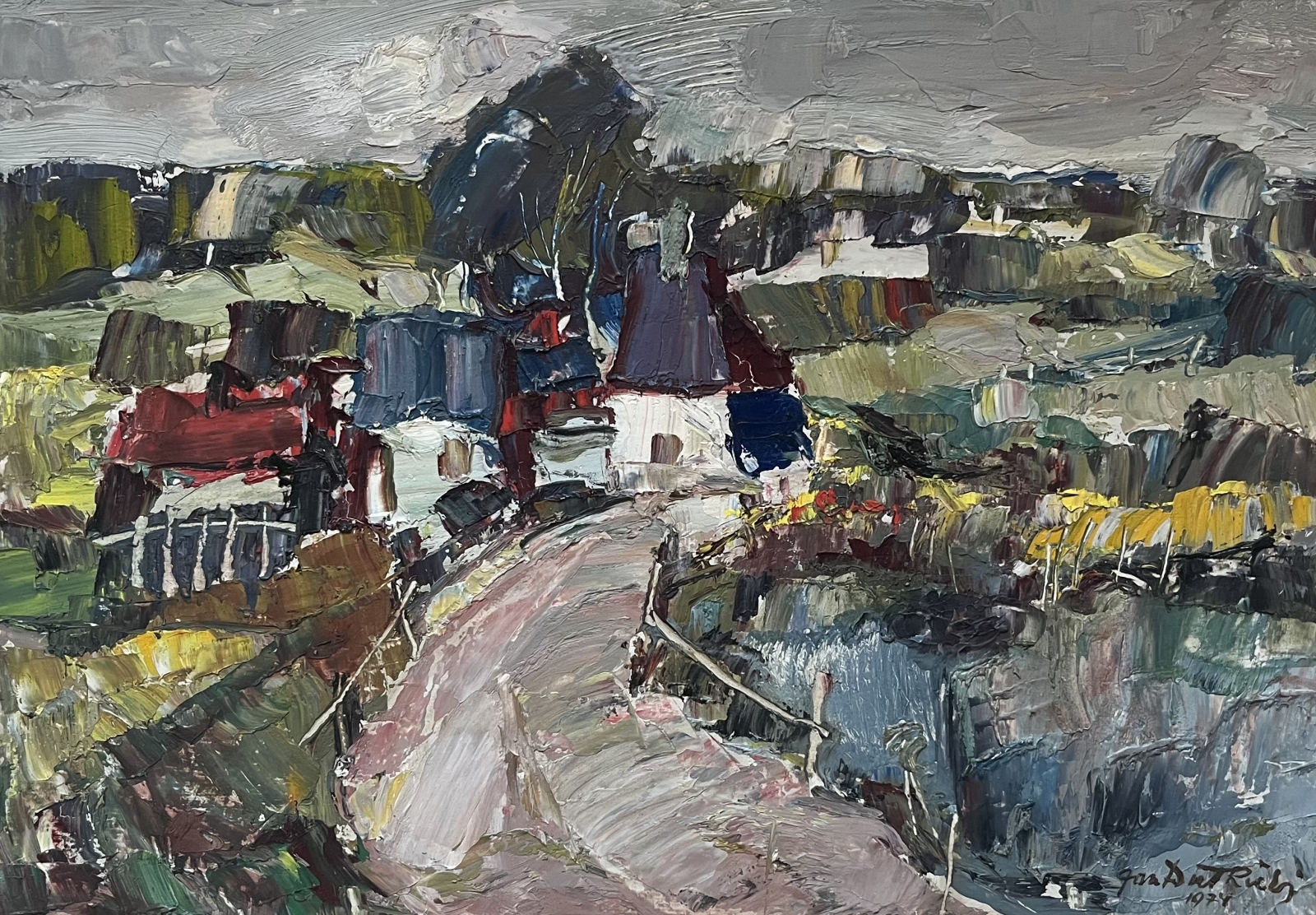 Obraz olejny na kartonie, sygnowany pd. Jan Dutkiewicz 1974.  Format 33,5x48 cm. Obraz powstał podczas Ogólnopolskiego Pleneru Malarskiego "Solina 1974". Oprawiony w ramę 50x70 cm.  za szkłem.