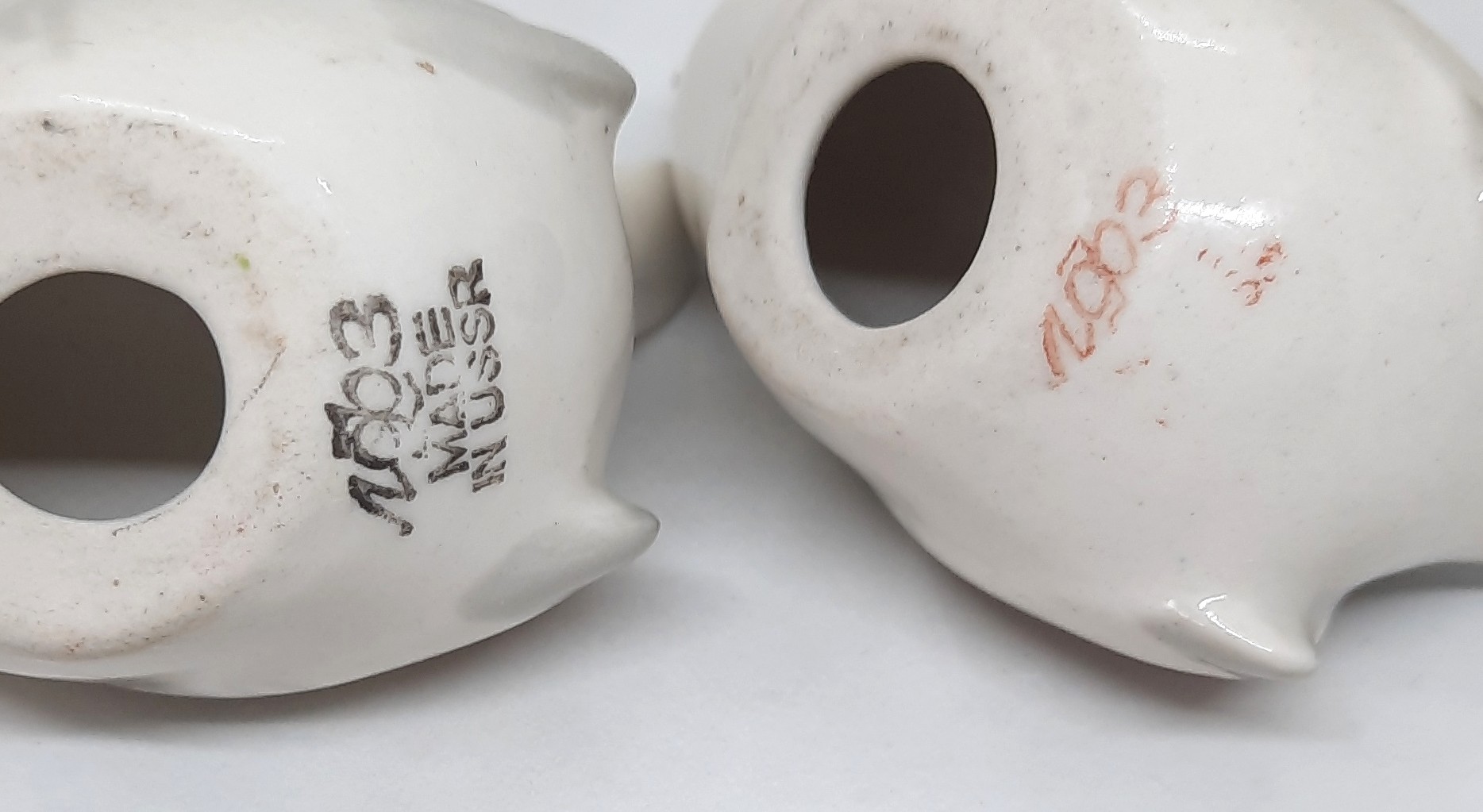 porcelana szkliwiona / malatury podszkliwne; sygn. Łomonosow; wys. 5 cm, dł. 6,5 cm; stan zachownia: bardzo dobry; ZSRR II poł. XX w.