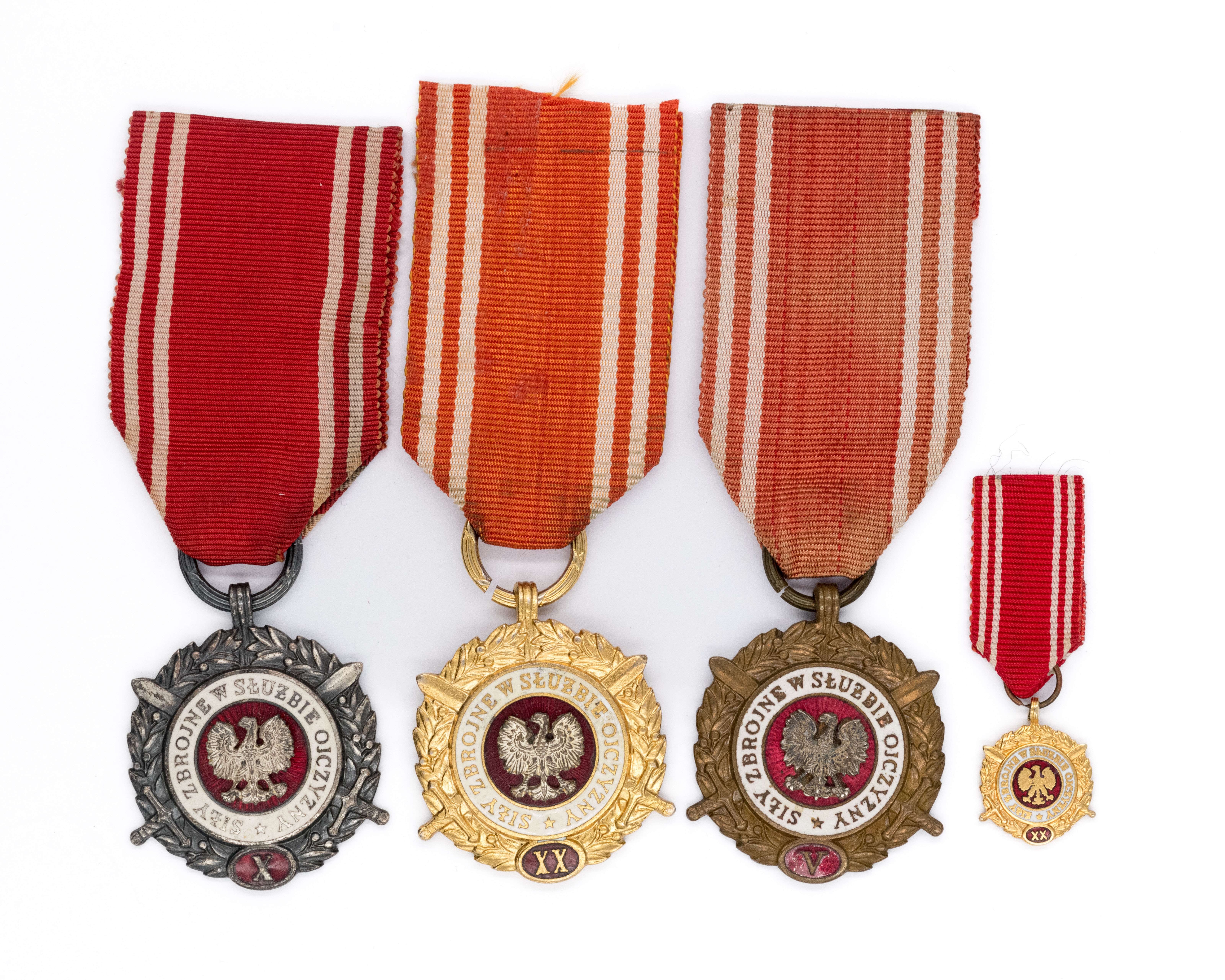 Zestaw 3 medali Siły Zbrojne w Służbie Ojczyzny z miniaturą. 1) Brązowy za V lat, 2) Srebrny za X lat, 3) Złoty XX lat. Śr. 34mm, metal, emalia, nakładany orzeł, stan dobry - zachowane oryginalne wstążki, lekkie zabrudzenia emalii.