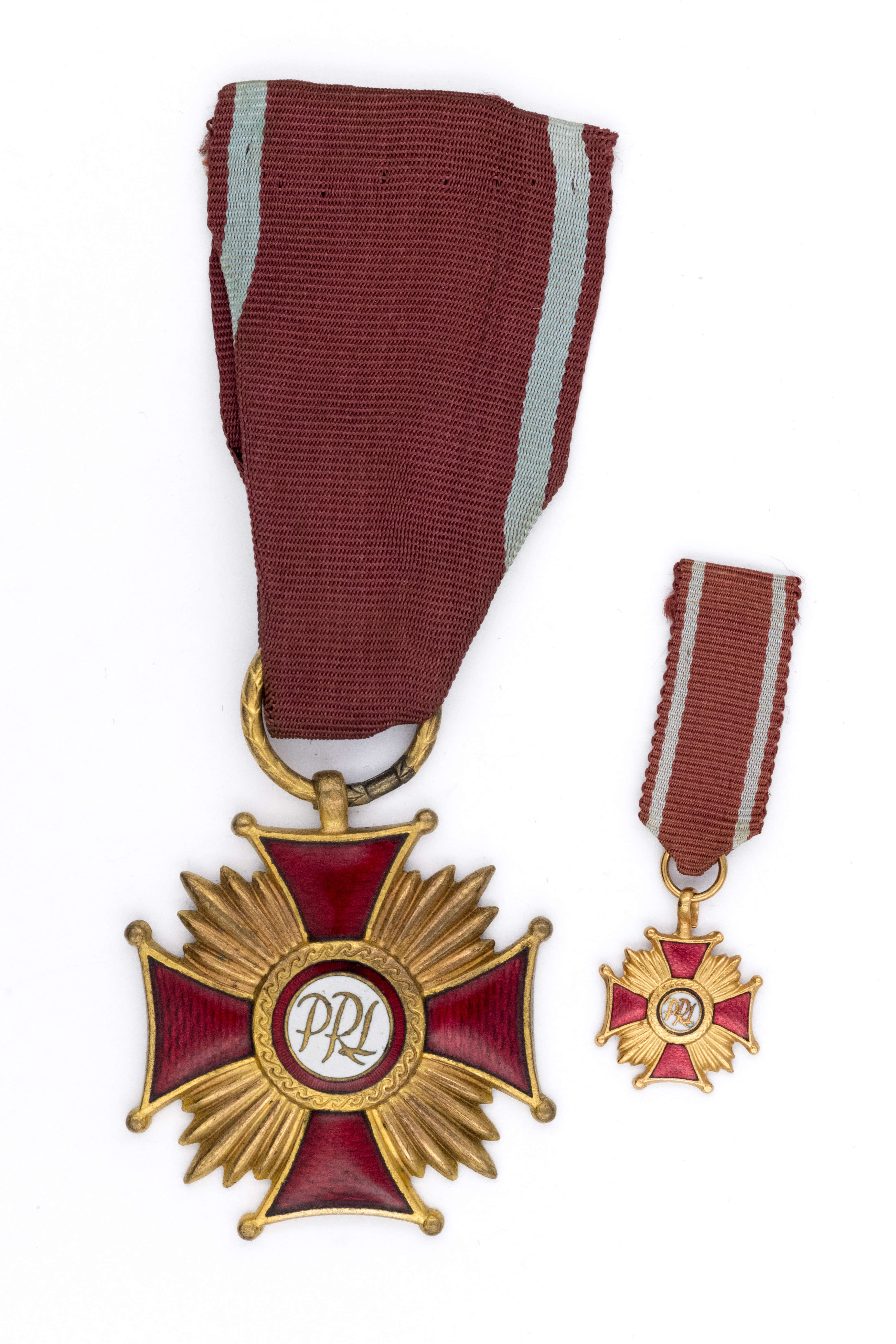 Złoty Krzyż Zasługi PRL z miniaturą, 43 x 43mm, metal złocony, emalia, stan bardzo dobry - zachowane oryginalne wstążki.