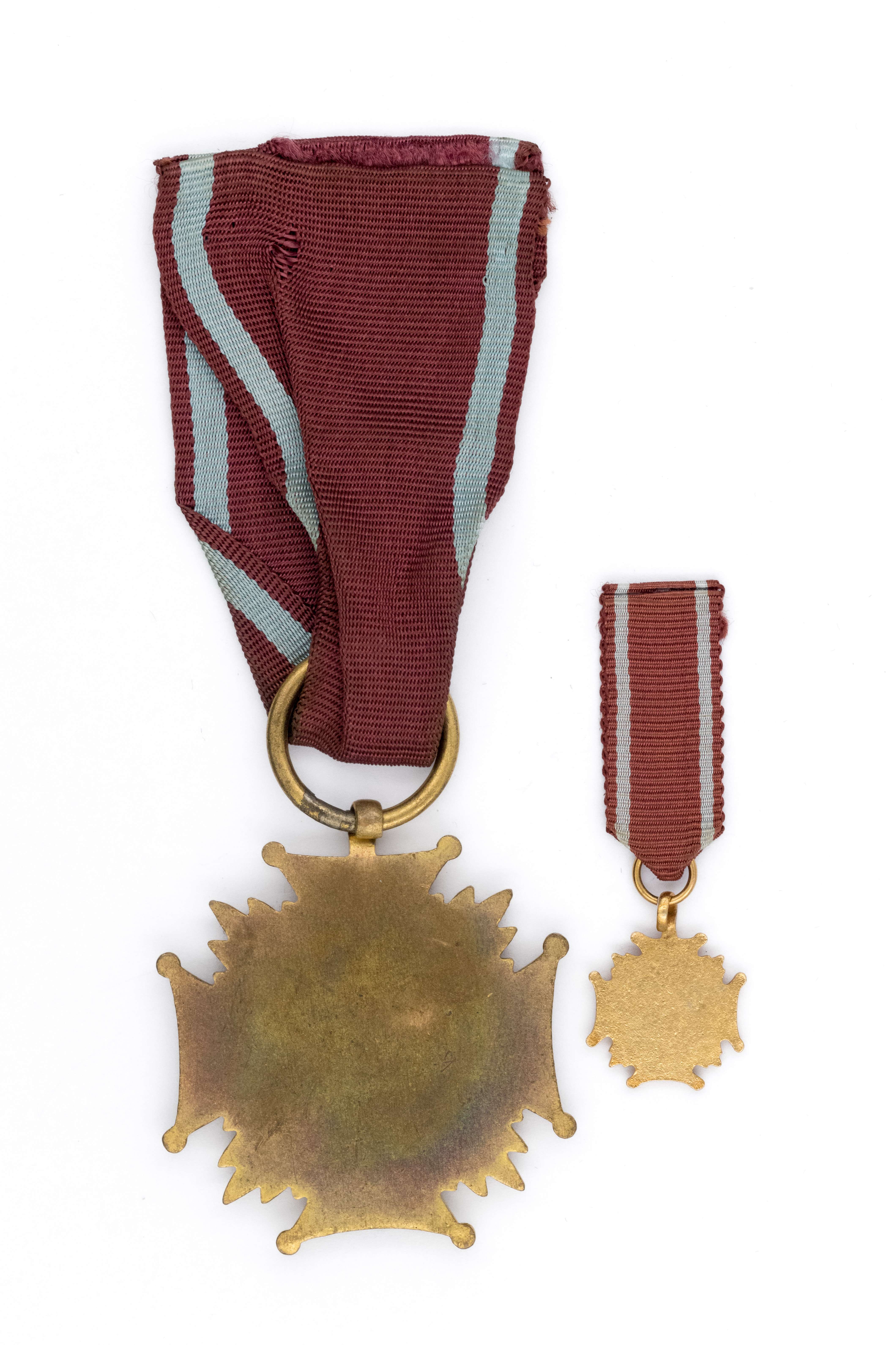 Pozycja: Złoty Krzyż Zasługi PRL z miniaturą, 43 x 43mm, metal złocony, emalia, stan bardzo dobry - zachowane oryginalne wstążki
