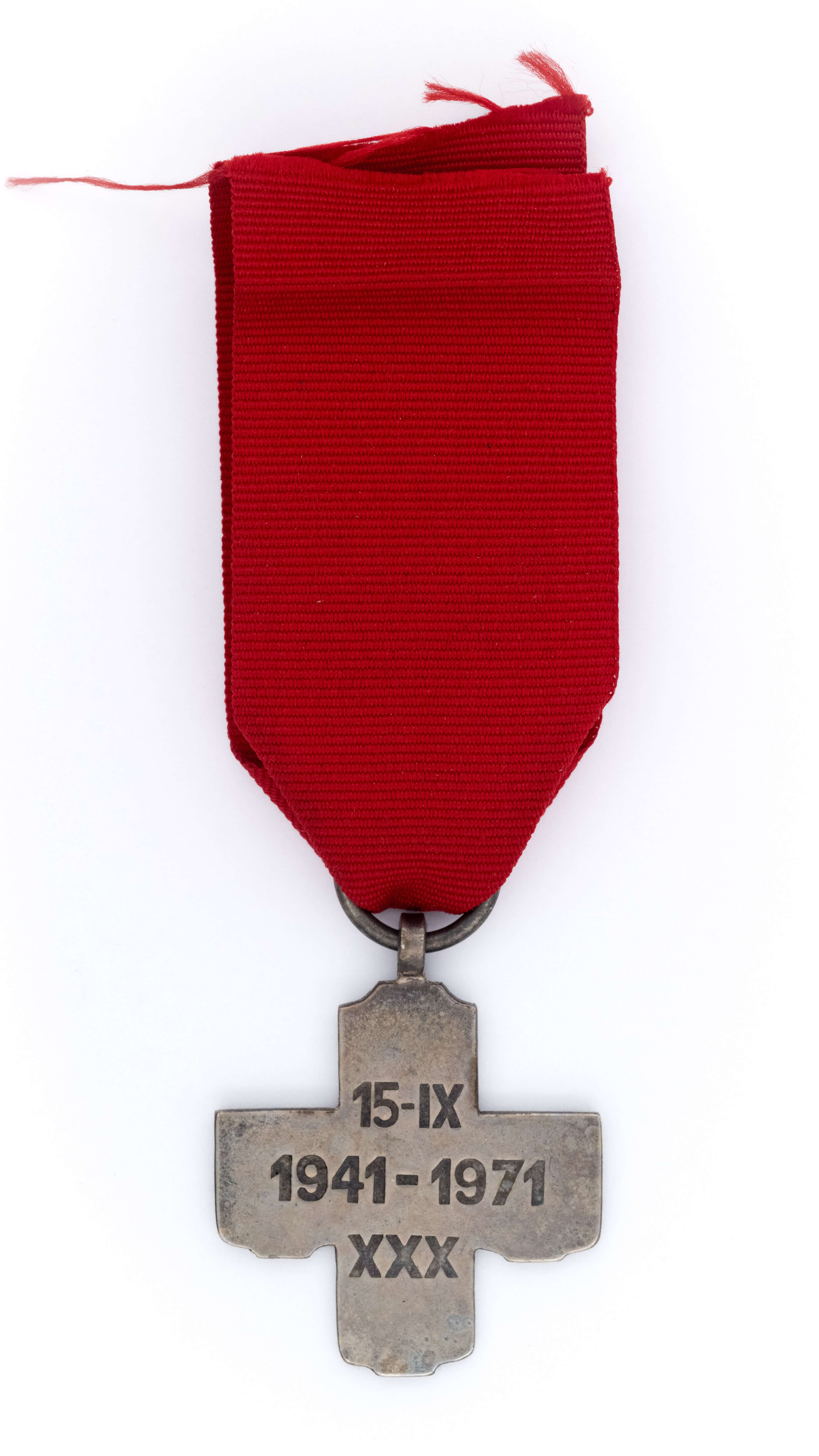 Srebrny Krzyż XXX Lat 5 Kresowej Dywizji Piechoty 1941-1971 15 - IX. 37 x 36mm, stan bardzo dobry - zachowana oryginalna wstążka.